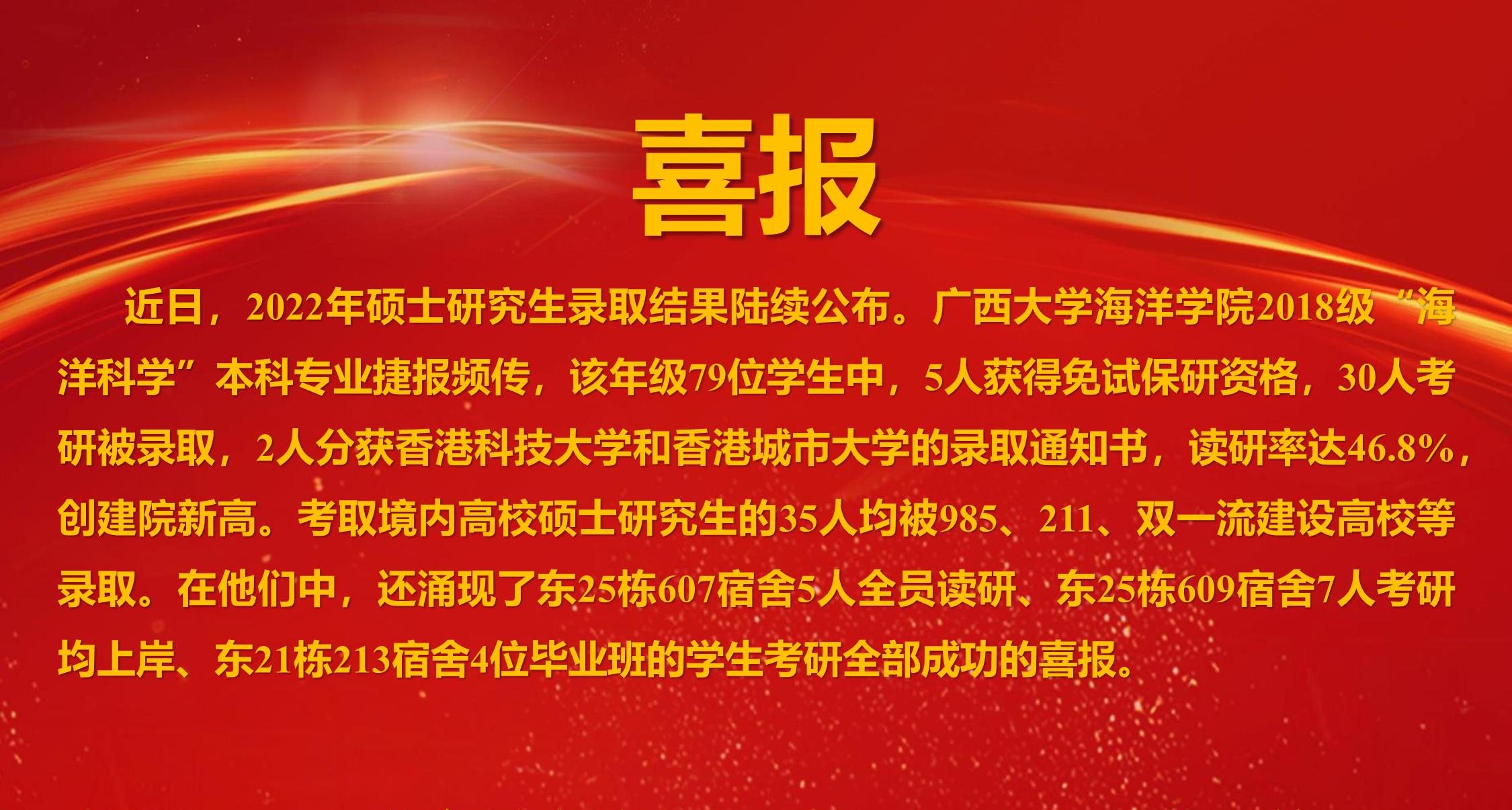 近日,2022年硕士研究生录取结果陆续公布。太阳集团122cc2018级“海洋科学”本科专业捷报频传,该年级79位员工中,5人获得免试保研资格,30人考研被录取,2人分获香港科技大学和香港城市大学的录取通知书,读研率达46.8%,创建院新高。考取境内高校硕士研究生的35人均被985211、“双一流”建设高校等录取。在他们中,还涌现了东25607宿舍5人全员读研、东25609宿舍7人考研均上岸、东21213宿舍4位毕业班的员工考研全部成功的喜报。