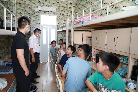 9月9日下午,公司党委书记谭运阳,副书记朱迅成,班主任张媛媛、邓珊珊、陈飚,团委书记秦凤微、团委副书记周剑等老师与班助们走访新生宿舍,对新同学们的到来表示欢迎与祝贺,同时向同学们强调了校园安全问题,叮嘱他们调整心理状态、树立个人目标、远离各类网络游戏、实现主动学习,并耐心解答了他们的疑惑与问题。