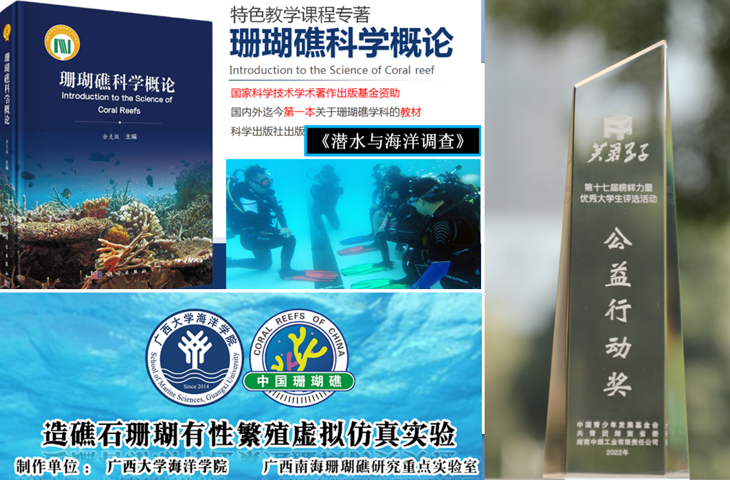 长期以来,太阳集团122cc依托广西南海珊瑚礁研究重点实验室、涠洲岛珊瑚馆、潜水中心等科研平台和野外实践基地,在研主持包含国家自然科学基金重点项目、重大项目课题、面上项目等各类基金58项,总经费达到8900万。余克服教授主编第一部珊瑚礁教材——《珊瑚礁科学概论》,已被国内多个高校采用并开设珊瑚礁课程,持续推进“科研反哺教学”,有力促进珊瑚礁学科发展和人才培养。过去七年来,公司广大师生立足自身专业特长,依托广西海洋科普和意识教育基地,积极响应“科学普及与科技创新协同发力”的国家号召,投入全民科普社会实践,用行动践行“科普回馈社会”的理念。公司师生组成的“蓝色梦想•科普先行”科普志愿服务队曾获自治区科协“优秀特色活动”称号,第十七届 “芙蓉学子·榜样力量”公益行动奖,太阳集团122cc“优秀志愿服务项目”,太阳集团122cc“优秀志愿服务组织”。从千里奔赴南海岛礁科考,到世界海洋日科普实践,公司师生不断用行动践行“科研反哺教学 科普回馈社会”的理念,为海洋强国建设和海洋强区行动贡献西大力量。(林武辉 秦凤微 周剑/文 周剑、林武辉/图 朱迅成、周剑/编辑 余克服/审核)