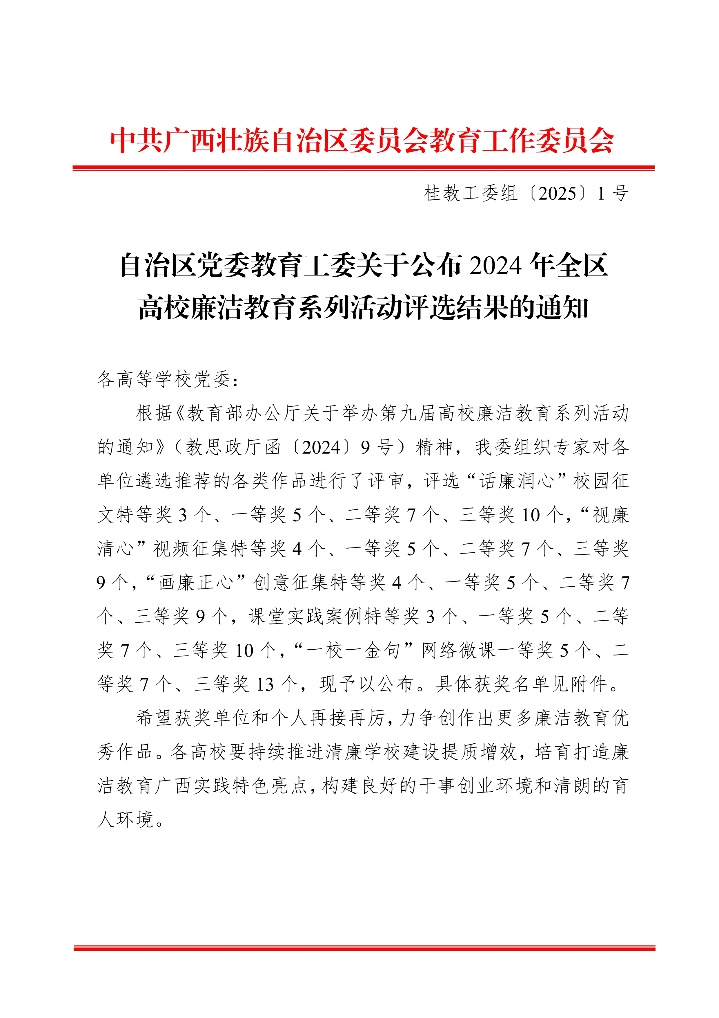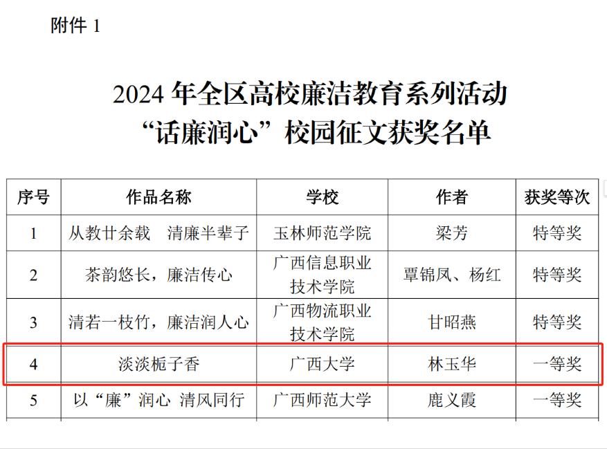 近日,自治区党委教育工委公布了2024年全区高校廉洁教育系列活动评选结果,公司林玉华老师的作品《淡淡栀子香》荣获2024 年全区高校廉洁教育系列活动“话廉润心”校园征文一等奖。 公司党委对本次活动高度重视,积极组织推荐林玉华老师的作品《淡淡栀子香》。经校内初审后,推送到全区参加评选,最终荣获一等奖。这是公司在本次系列活动的征文比赛项目中获得的唯一一项一等奖。 文字作者:周剑 编辑:周剑 一审一校:林玉华 二审二校:刘旗扬 三审三校:黄学勇
