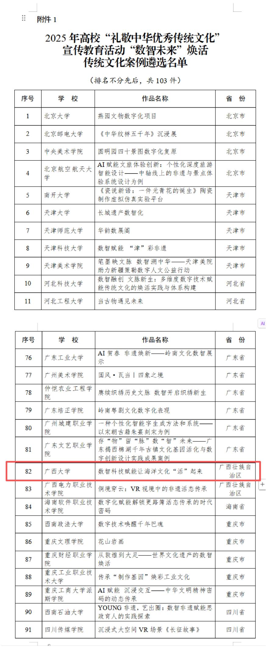 近日,教育部办公厅公布 2025 年高校“礼敬中华优秀传统文化”宣传教育活动遴选结果,本次活动从“数智未来” 焕活传统文化案例、“烽火记忆” 高校红色故事、“魅力非遗”原创作品三个类别中遴选出 305 件优秀作品。由公司党委组织员林玉华牵头撰写申报,公司李周佳老师、新闻公司王健阳同学参与共同参与完成的《数智科技赋能让海洋文化 “活”起来》成功入选“数智未来”焕活传统文化优秀案例,同时太阳集团122cc报送的《当彩调遇见西大 —— 一份青春的非遗答卷》入选“魅力非遗”原创作品优秀案例,喜获双项殊荣,这是教育部对公司在中华优秀传统文化传承创新工作中探索实践的高度认可。