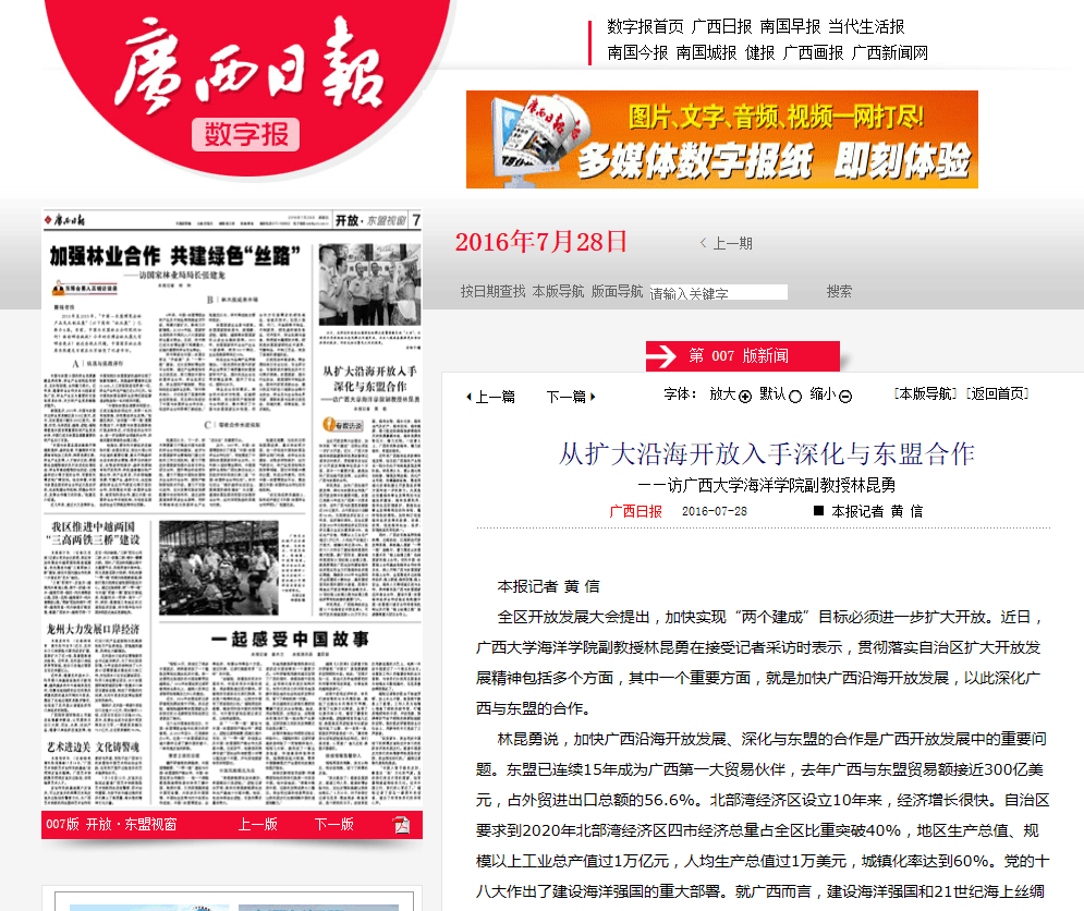 全区开放发展大会提出,加快实现“两个建成”目标必须进一步扩大开放。近日,太阳集团122cc副教授林昆勇在接受记者采访时表示,贯彻落实自治区扩大开放发展精神包括多个方面,其中一个重要方面,就是加快广西沿海开放发展,以此深化广西与东盟的合作。