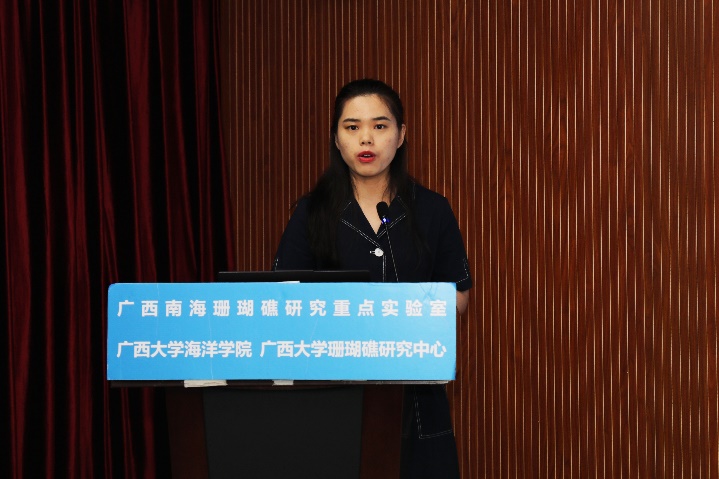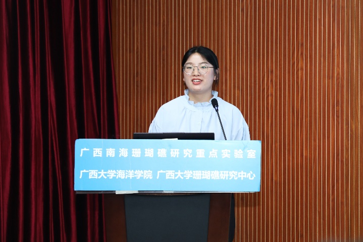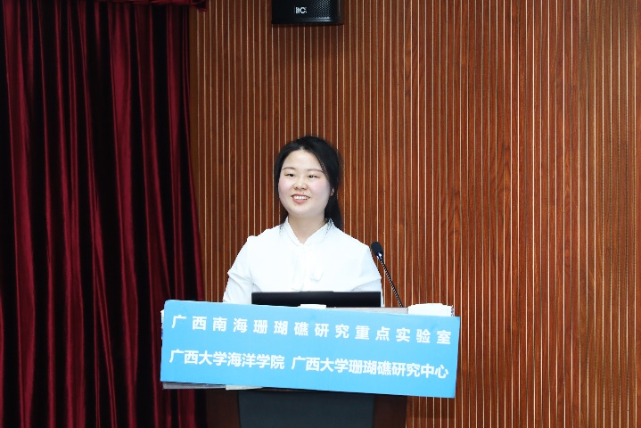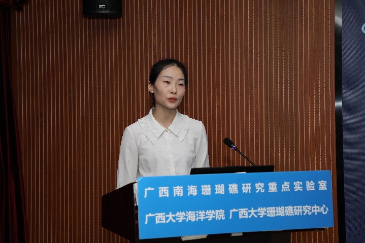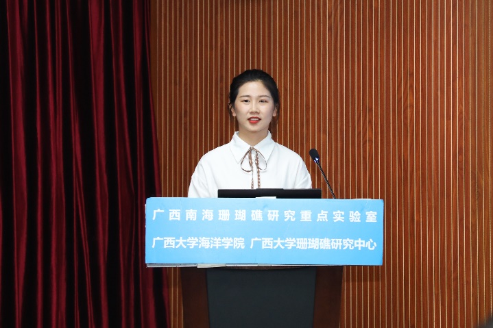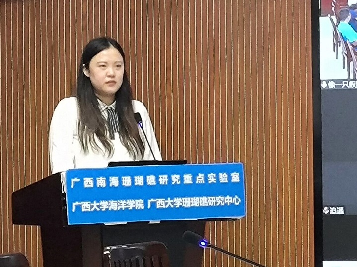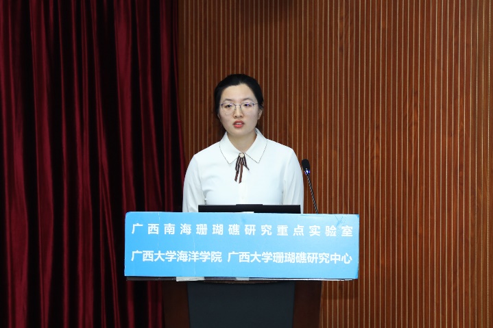 张晶晶同学(导师:裴继影博士)主要对涠洲岛十字牡丹珊瑚高温胁迫前后的代谢物变化进行了相关研究,其论文题目是《基于质谱代谢组学探究珊瑚对高温胁迫的代谢应答机制》。张晶晶同学本科毕业于安徽科技公司生命科学公司,于2018年9月至本校就读研究生,主要研究方向为生物分析化学。读研期间,担任班级团支书职务,并参与广西自然科学基金面上项目:基于代谢组学的珊瑚共生体制响应高温胁迫的生化机制。