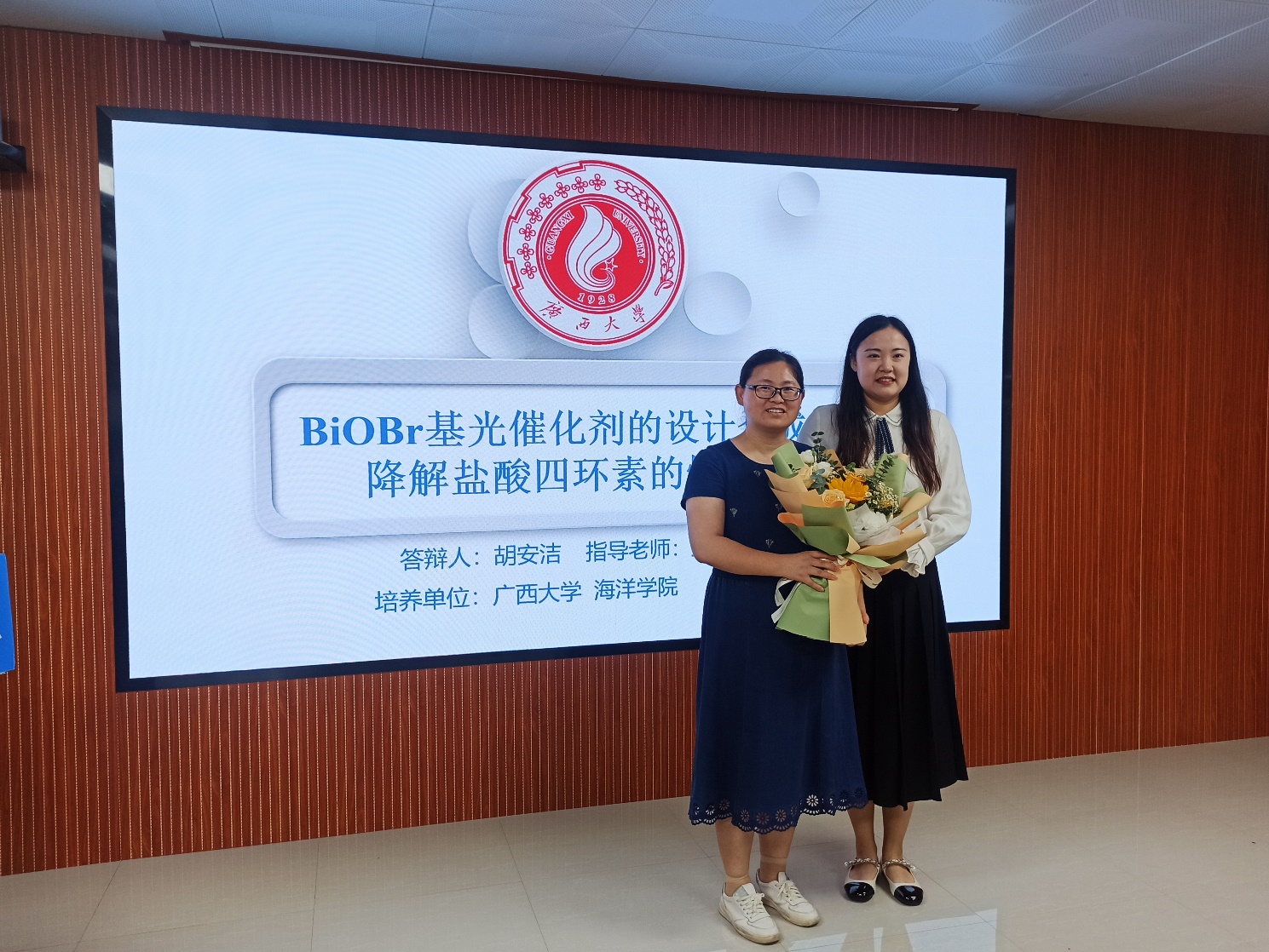 胡安洁同学(导师:王丽伟副教授)主要对水体抗生素高效降解进行了相关研究,其论文题目是《BiOBr基光催化剂的设计合成及其降解盐酸四环素的性能研究》。胡安洁本科毕业于济南大学化学化工公司,于2019年9月考研至本校就读研究生,主要研究方向为海洋环境与化学。读研期间,担任院硕士研究生第二党支部副书记兼纪检委员,并以导师一作员工二作在国际环境领域一区期刊《Applied Surface Science》上发表一篇SCI论文:《Degradation of tetracycline hydrochloride (TCH) by active photocatalyst rich in oxygen vacancies: Performance, transformation product and mechanism》。