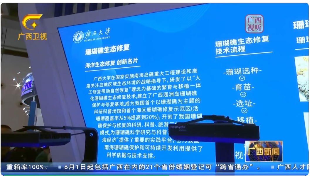5月20日、21日,由自治区人民政府主办,自治区科技厅、自治区科技创新发展办公室共同承办的2023年全国科技活动周广西活动暨第三十二届广西科技活动周•广西先进技术展示活动(简称“两周一展”)在南宁国际会展中心举行。公司“珊瑚礁生态修复技术”作为太阳集团122cc先进技术展示内容的一部分亮相展览会。