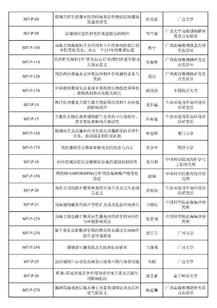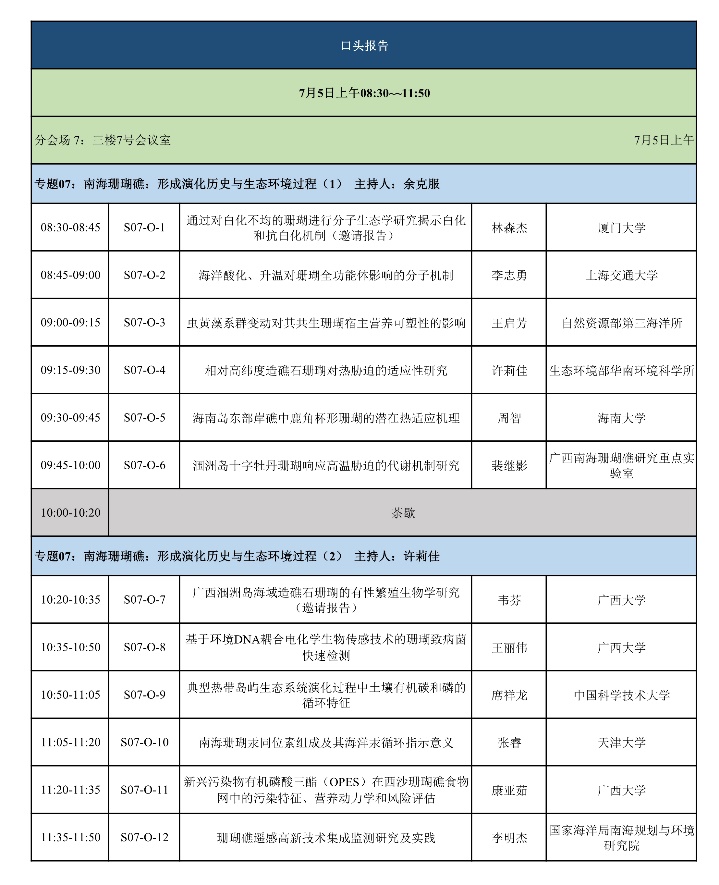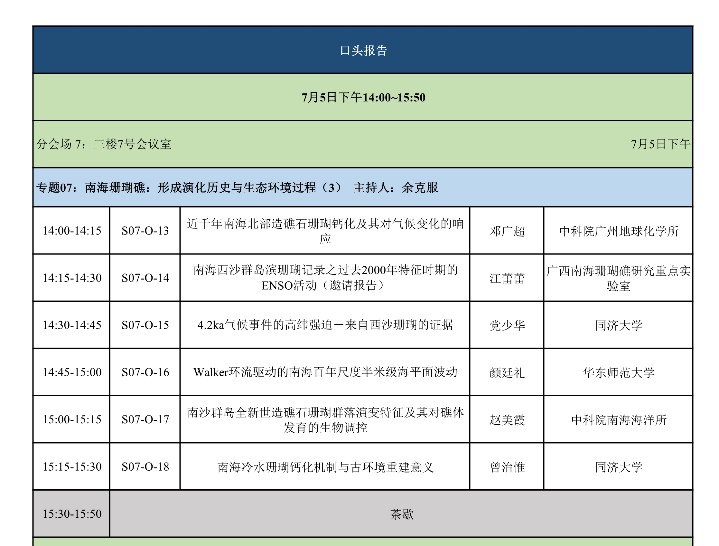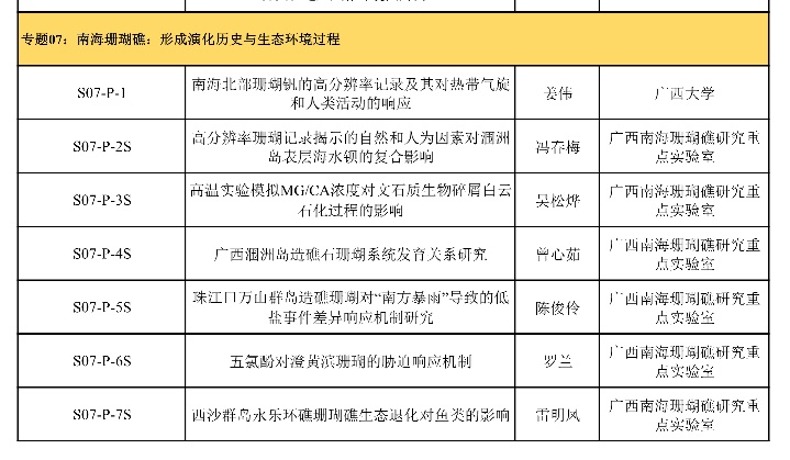 “南海珊瑚礁”专题口头报告日程