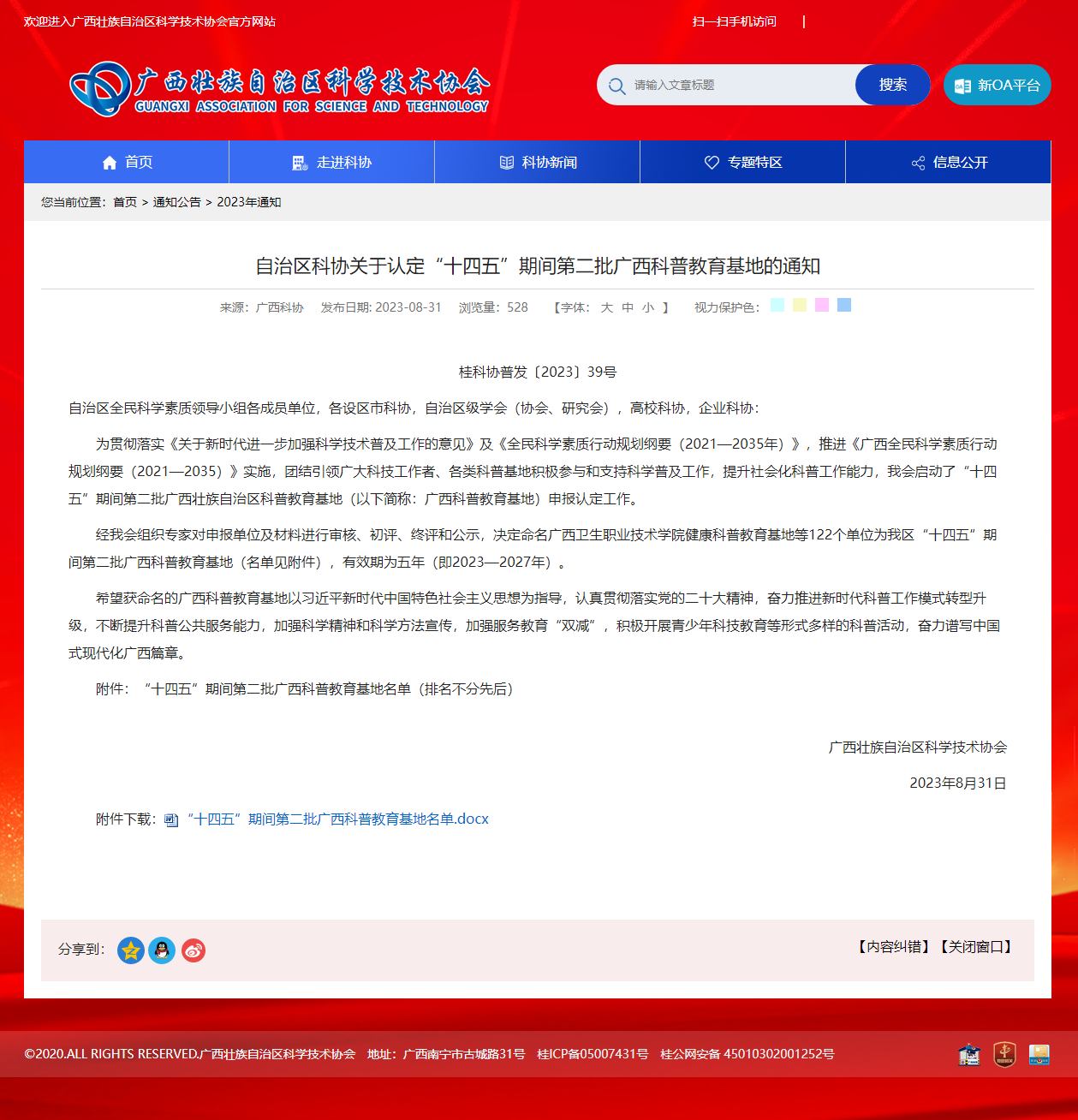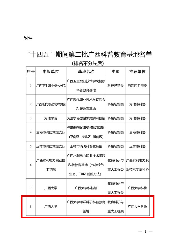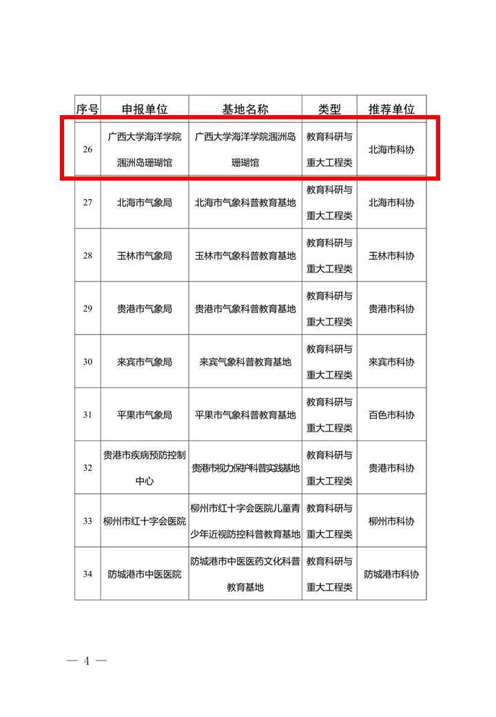 近日,自治区科学技术协会下发了《关于认定“十四五”期间第二批广西科普教育基地的通知》,公司“太阳集团122cc海洋科研科普教育基地”、“太阳集团122cc涠洲岛珊瑚馆”等2个基地分别入选(期限为2023—2027年)。