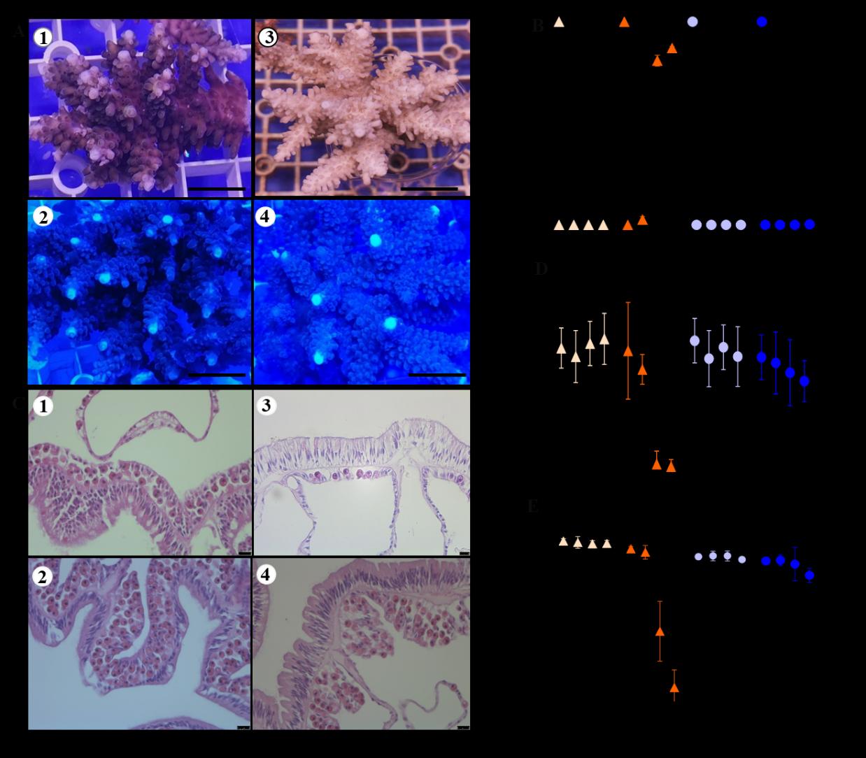 图1. 不同培养条件下珊瑚组织及生理特征照片