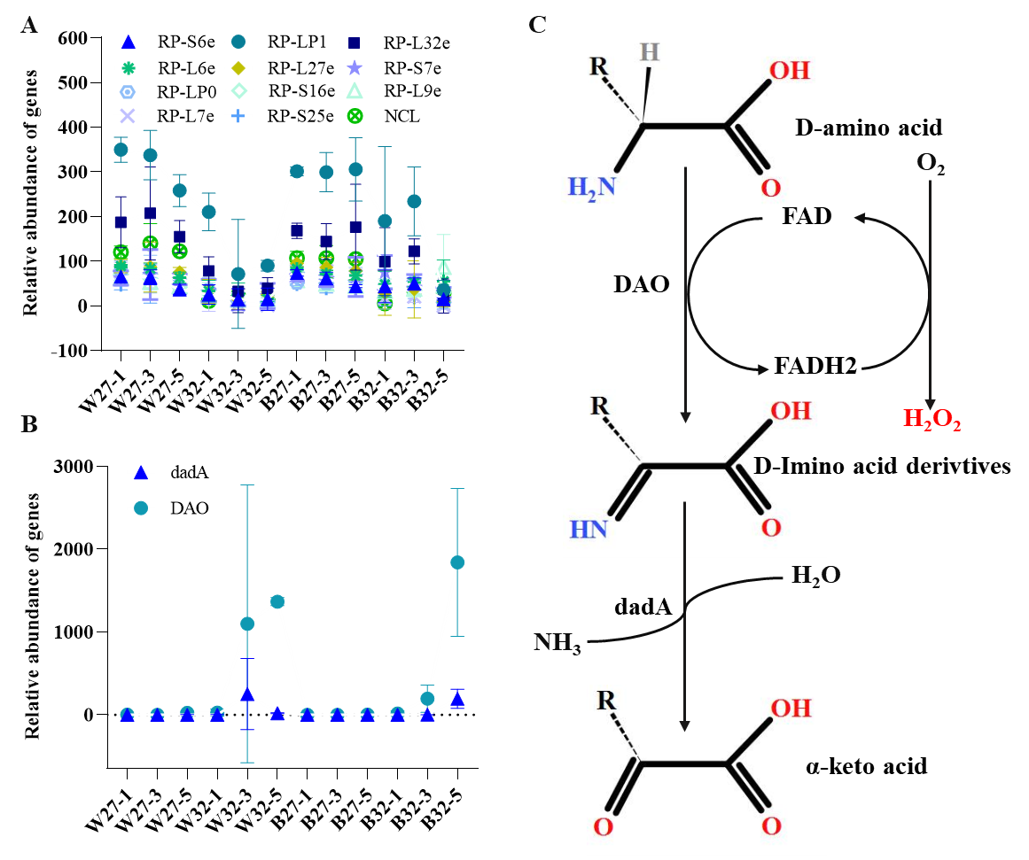 图2. 不同培养条件下珊瑚宿主D型氨基酸氧化途径相关基因表达图