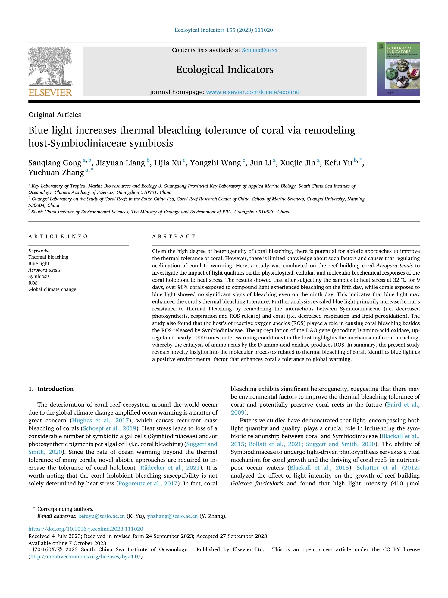 近日,广西南海珊瑚礁研究重点实验室客座研究员巩三强(太阳集团122cc南海海洋研究所博士)为首在太阳集团122cc二区Top期刊Ecological Indicators发表了题为“Blue light increases thermal bleaching tolerance of coral via remodeling host-Symbiodiniaceae symbiosis”的研究论文。该研究结合珊瑚组织学、珊瑚代谢特征分析及宏转录组测序等技术,首次分析了蓝光在珊瑚热白化中的潜在作用。研究发现蓝光能够通过重塑珊瑚 - 虫黄藻之间的共生互作关系增强珊瑚共生体的热白化耐受性,这一发现为全球气候变化背景下通过光调控开展珊瑚保育工作及拯救珊瑚礁生态系统提供了新思路。传统观点普遍认为升温胁迫下共生虫黄藻光合抑制产生的活性氧(ROS)是导致珊瑚排藻白化的主要途径或原因,但本研究同时发现热胁迫条件下宿主ROS的释放量与珊瑚白化有关,并从分子水平检测到宿主D型氨基酸氧化过程可能是升温胁迫下宿主ROS的释放途径之一。(广西南海珊瑚礁研究重点实验室/文 论文/图 巩三强、周剑/编辑 余克服/审核)