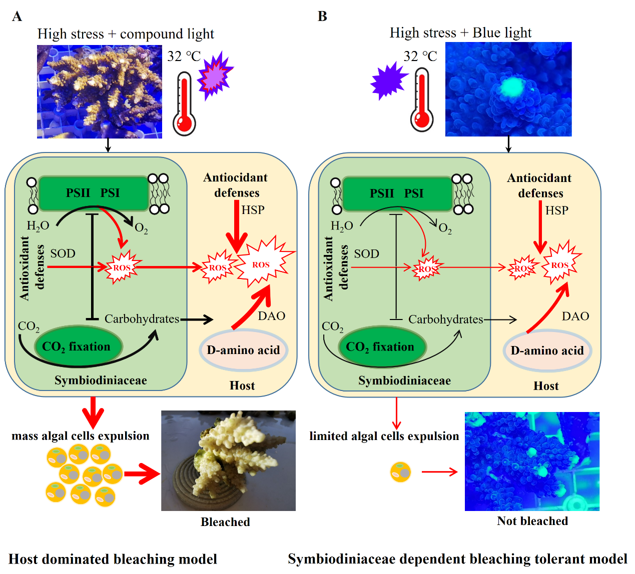图3. 不同光质条件下珊瑚白化模式图
