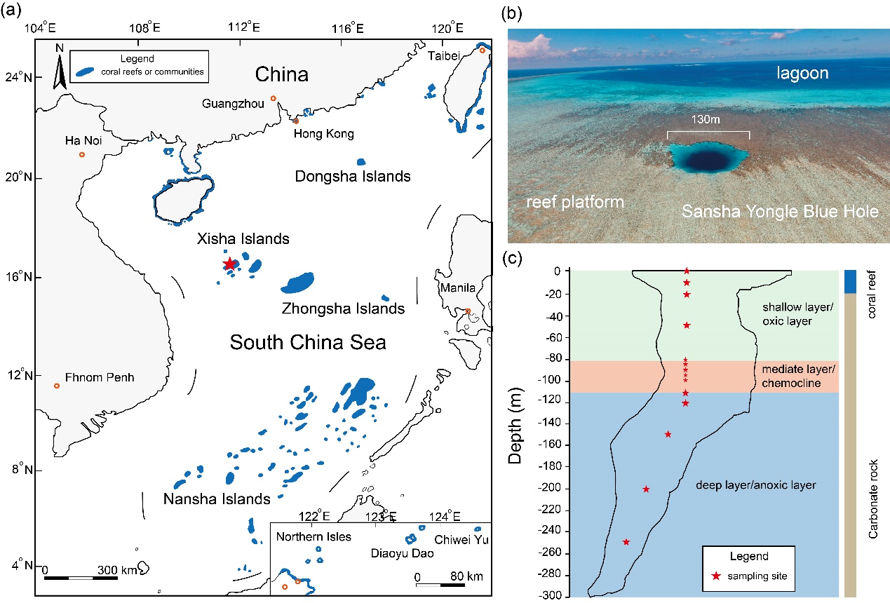 近日,公司海洋生物与生态教研室陈飚博士等在太阳集团122cc一区Top期刊Microbiology Spectrum发表了题为“The diversity, community dynamics, and interactions of the microbiome in the world’s deepest blue hole: insights into extreme environmental response patterns and tolerance of marine microorganisms”的研究论文。该研究基于微生物组学技术,对西沙群岛珊瑚礁区的世界最深蓝洞—三沙永乐龙洞(300.89m)14个深度剖面的水体微生物进行了研究,解析微生物主要功能类群(虫黄藻、细菌、真菌以及古菌)在不同深度极端环境下的多样性变化、生态特征及其生物地球化学循环功能差异。