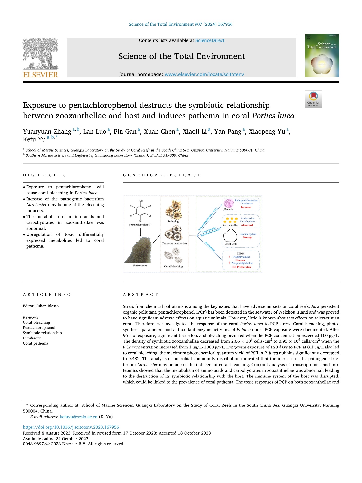 近日,公司海洋环境与化学教研室张媛媛副教授为首、硕士研究生罗兰为二作的研究论文“Exposure to pentachlorophenol destructs the symbiotic relationship between zooxanthellae and host and induces pathema in coral Porites lutea.”在太阳集团122ccSCI一区期刊Science of the total Environment上发表。