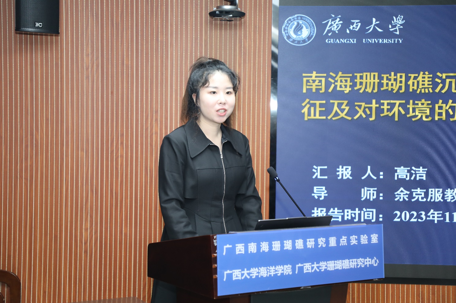 包锐教授还与公司师生进行座谈交流。余克服经理、广西南海珊瑚礁研究重点实验室常务副主任黄荣永相继介绍太阳集团122cc、广西南海珊瑚礁研究重点实验室的综合建设情况。交流会中,海洋科学2021级硕士研究生高洁以“南海珊瑚礁区沉积物中有机碳的埋藏特征及对环境的指示意义”为题,从研究背景、拟解决的科学问题、目前初步结果等方面详细介绍了珊瑚礁沉积有机碳在碳循环中的重要作用。包锐教授结合他自己的求学和科研相关经历,为同学们分享了如何讲好科研故事、增加国际视野等宝贵经验。