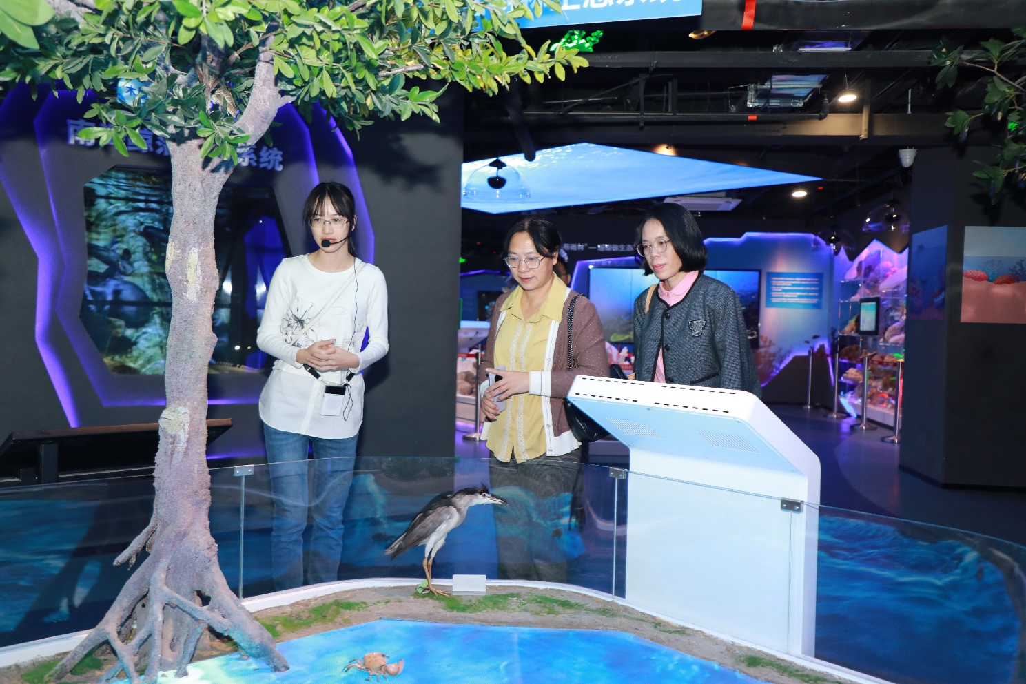 福建农林大学太阳集团122cc副经理黄小红教授(中)考察太阳集团122cc海洋科教馆