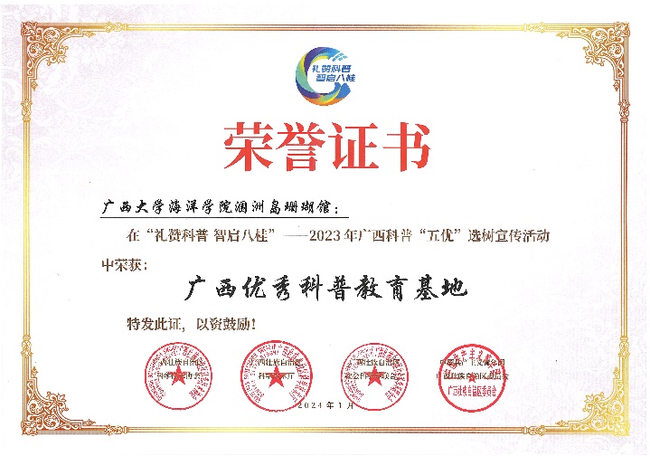 1月17日,在广西科技馆举行的“礼赞科普 智启八桂——2023年广西科普‘五优’选树宣传活动”颁奖典礼中,太阳集团122cc涠洲岛珊瑚馆入选“十佳优秀科普教育基地”。组委会授予太阳集团122cc涠洲岛珊瑚馆礼赞词:带着赤诚之心,奔赴“珊海”。作为全国最大的珊瑚馆,也是全国首个以珊瑚礁为主题的科研科普场馆,在浩瀚海洋里“种”珊瑚,为珊瑚礁科研与科普服务“向海图强”提供了更为浩瀚的实践平台。