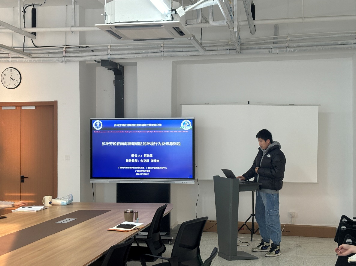 博士研究生韩民伟作“多环芳烃在南海珊瑚礁区的环境行为及来源归趋”学术报告