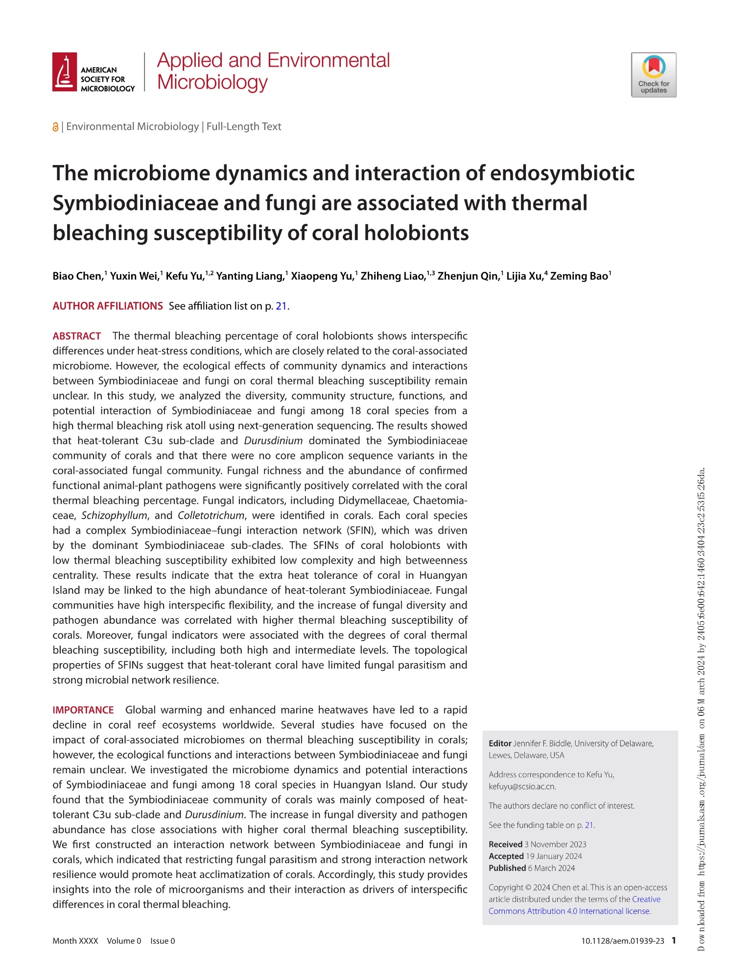 近日,公司海洋生物与生态教研室陈飚博士等在美国微生物学会(American Society for Microbiology;ASM)旗下权威期刊Applied and Environmental Microbiology(太阳集团122cc二区Top)上发表了题为“The microbiome dynamics and interaction of endosymbiotic Symbiodiniaceae and fungi are associated with thermal bleaching susceptibility of coral holobionts”的最新研究成果。