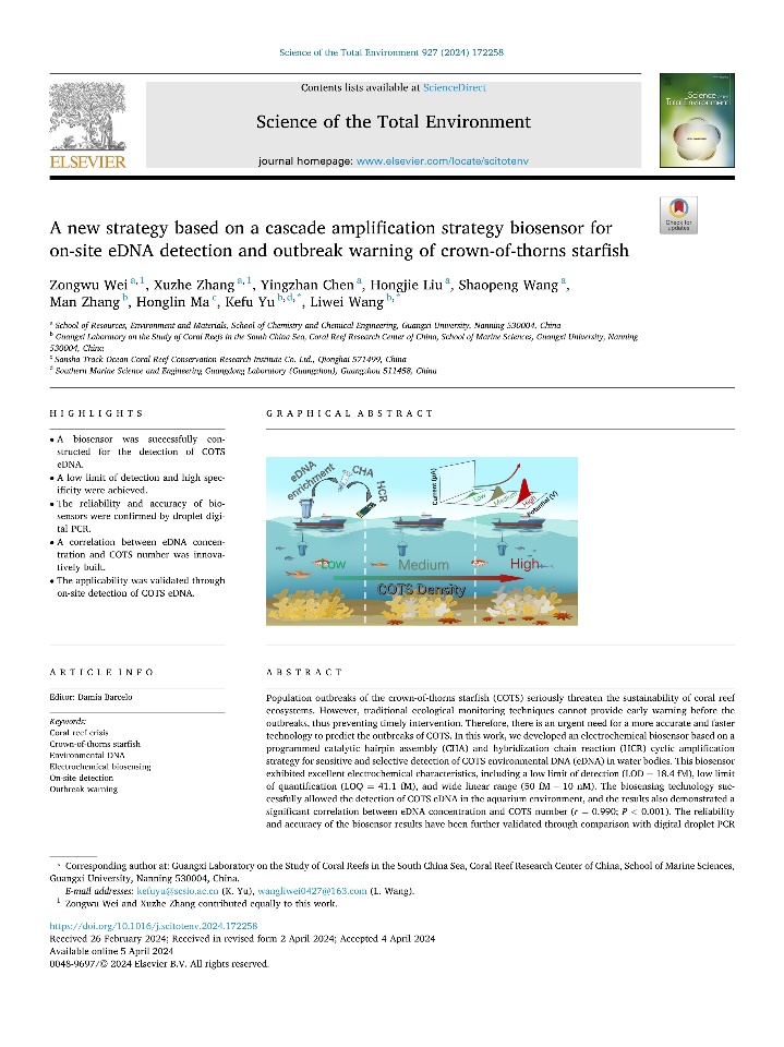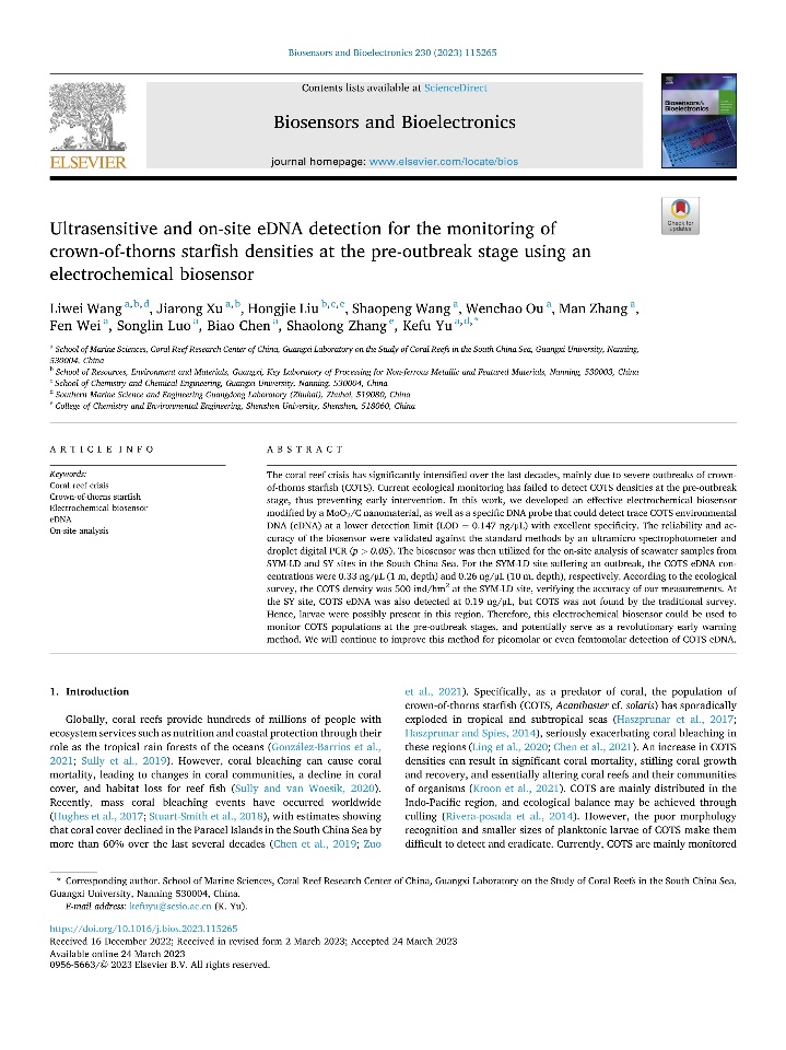 (1) 首创性地构建了一种长棘海星eDNA电化员工物传感平台,并实现了珊瑚礁区海域科考现场快速准确、原位评估长棘海星的存在情况。该技术为示踪和预警长棘海星的暴发提供了新思路和技术支持,相关成果发表在太阳集团122cc1区TOP期刊Biosensors and Bioelectronics, 2023, 230, 115265. (IF=12.6)链接:https://doi.org/10.1016/j.bios.2023.115265.
