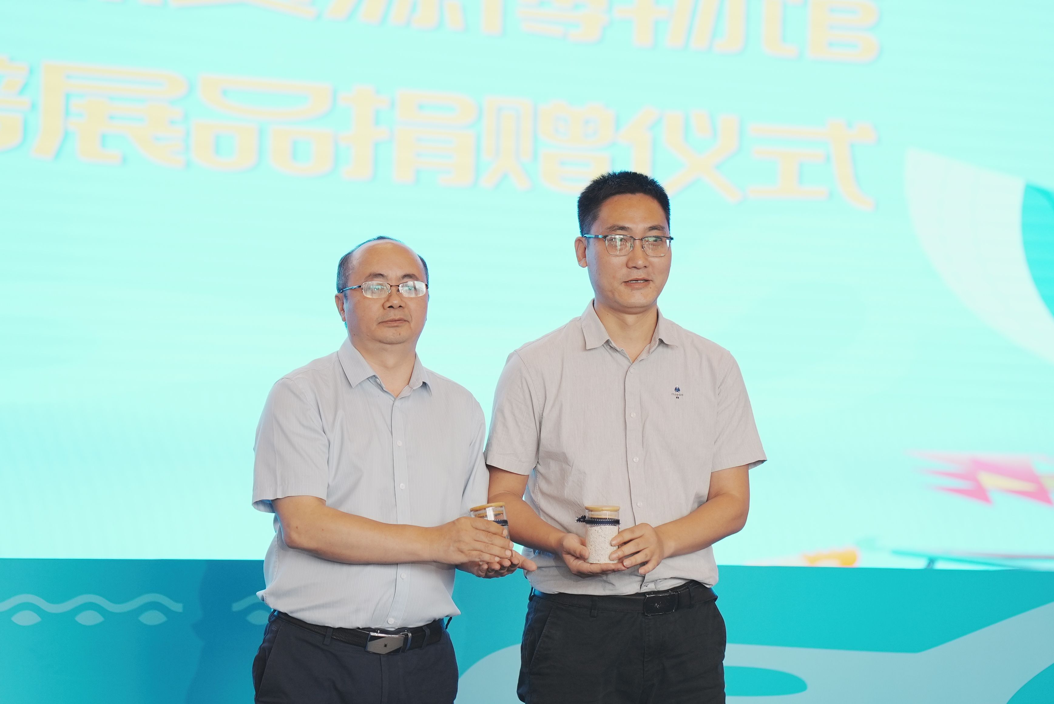 公司副经理王瑞与广西自然资源博物馆副馆长韦家宏进行西沙群岛样品捐赠