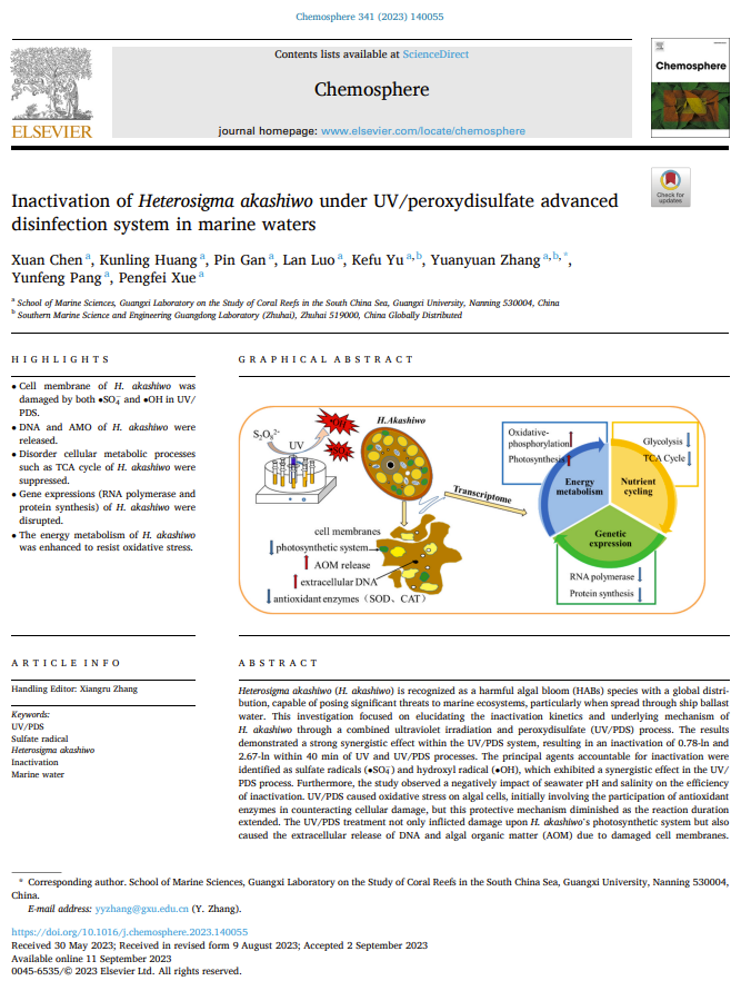 研究发现,UV/PDS显著提高了赤潮异弯藻的灭活效率,其中•SO4−对其灭活的贡献率约为51.45%。转录组分析揭示了UV/PDS处理后,赤潮异弯藻细胞与能量代谢、碳水化合物代谢和蛋白质合成相关的差异基因。细胞增强光合作用和氧化磷酸化以获得额外的能量,而糖酵解、TCA循环和戊糖磷酸代谢等营养代谢过程受到抑制。核糖体和RNA聚合酶基因表达显著下调,组织蛋白水解酶基因表达上调,表明蛋白质合成受到抑制,蛋白质损伤加剧。目前相关成果被收录在太阳集团122cc2区期刊:Chemosphere. (IF = 8.1)