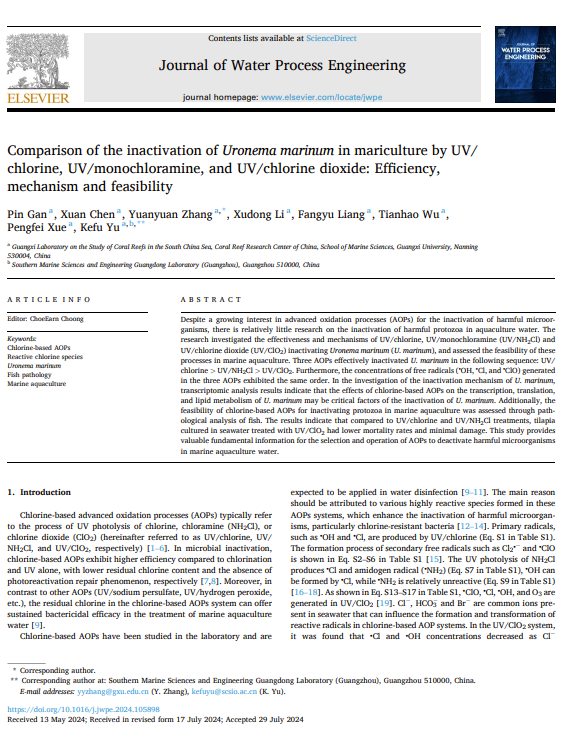 结果表明:与UV/NH2Cl和UV/ClO2系统相比,UV/chlorine系统可以产生更高浓度的活性氯自由基和•OH,从而更有效地灭活海洋尾丝虫。然而,UV/chlorine系统产生的消毒副产物比UV/NH2Cl和UV/ClO2更多。另外,本研究利用三种技术对含有海洋尾丝虫的海水进行处理,并利用处理后的海水进行幼年罗非鱼的饲养。结果表明, 尽管UV/ClO2系统中自由基的产生较少,但仍然能有效地灭活有害原生动物,产生了较少的消毒副产物,在UV/ClO2处理下罗非鱼受到的伤害最小,是一种安全高效的海水养殖水体消毒技术。