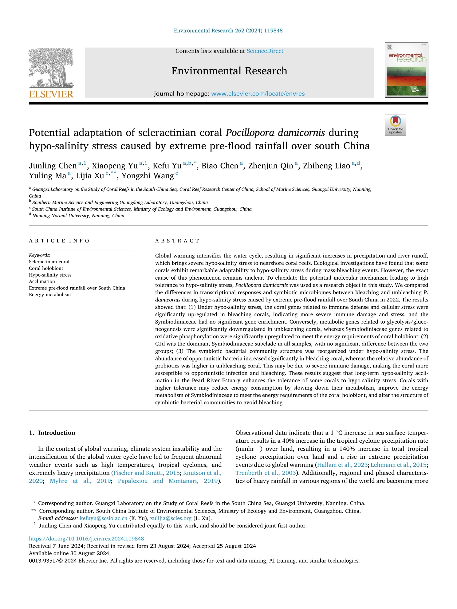 Chen Junling, Yu Xiaopeng, Yu Kefu, Chen Biao, Qin Zhenjun, Liao Zhiheng, Ma Yuling, Xu Lijia, Wang Yongzhi. (2024) Potential adaptation of scleractinian coral Pocillopora damicornis during hypo-salinity stress caused by extreme pre-flood rainfall over south China. Environmental Research. https://doi.org/10.1016/j.envres.2024.119848