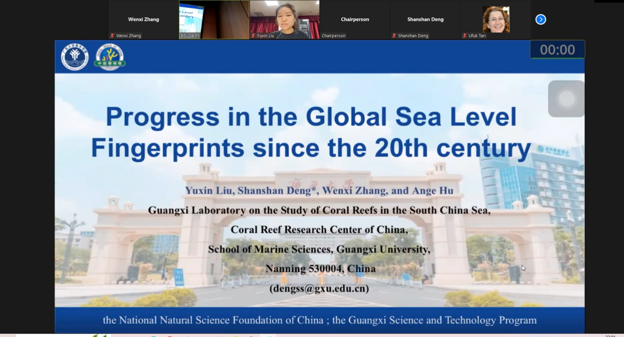 在“Climate: Past, Present & Future”主题的“Understanding sea level changes: global to local, from past to future)”分会场,邓珊珊博士作了题为“Attributing low-frequency variations in ocean water mass redistribution during 2002-2020”的口头报告,介绍关于气候变化背景下低频陆-海水质量再分布的特征与归因的最新研究进展。21级硕士研究生刘宇欣作了题为“Progress in the Global Sea Level Fingerprints since the 20th century”的口头报告,介绍关于20世纪以来三种气候变化背景下陆地水储量异常驱动的海平面指纹时空演变特征的最新研究进展。