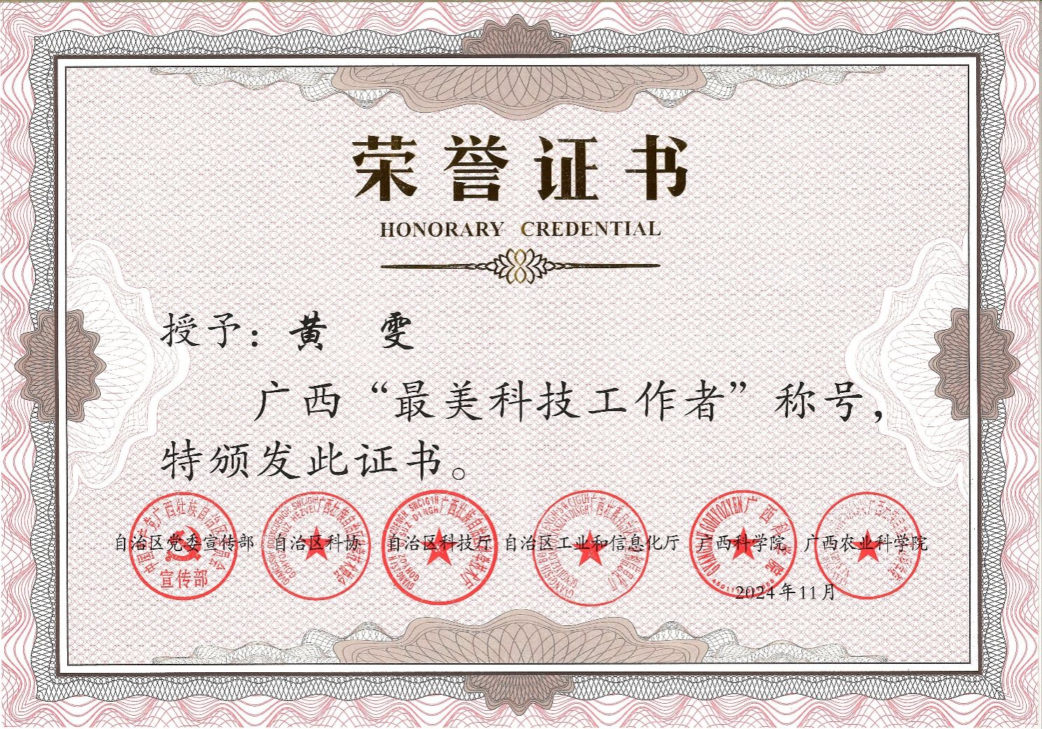 2024年广西“最美科技工作者”选树宣传活动由自治区党委宣传部、自治区科协、自治区科技厅、自治区工业和信息化厅、广西科公司、广西农业科公司等六部门开展,共10名2024年广西“最美科技工作者”人选。