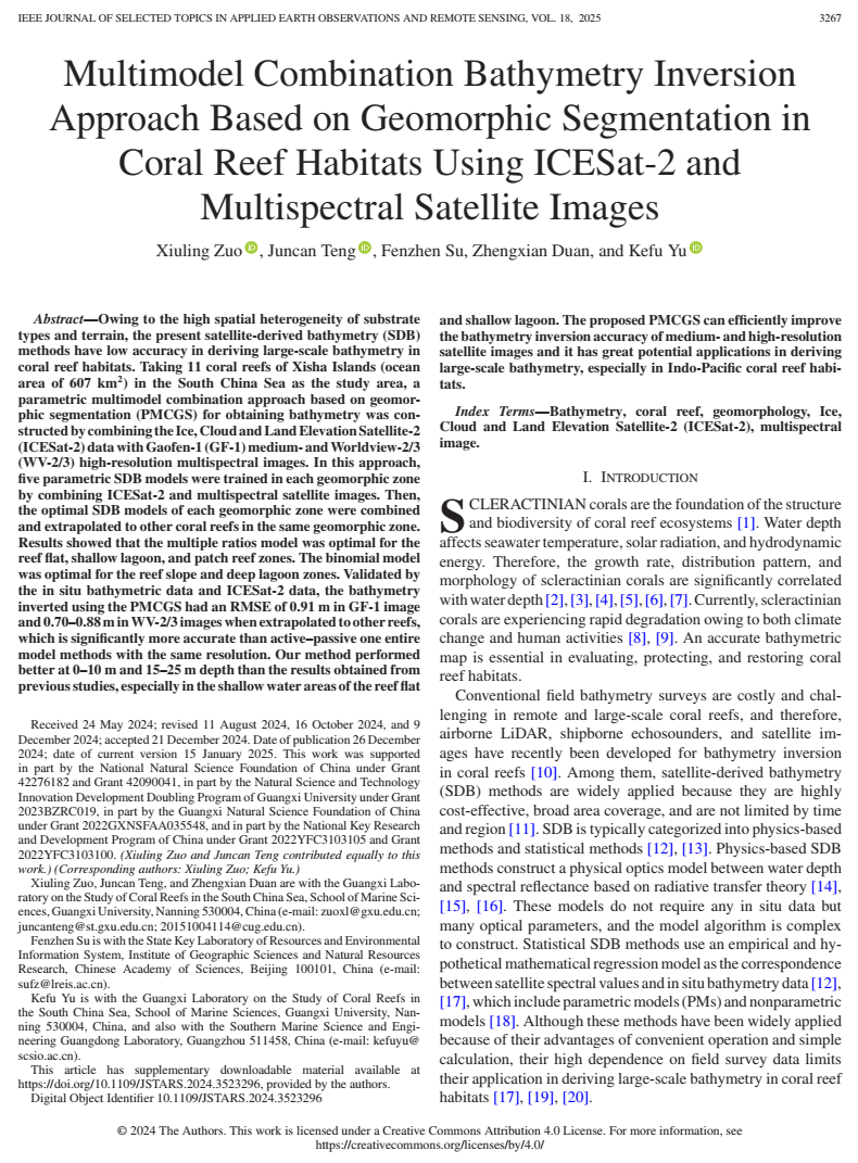 Xiuling Zuo, Juncan Teng, Fenzhen Su, Zhengxian Duan and Kefu Yu. Multimodel combination bathymetry inversion approach based on geomorphic segmentation in coral reef habitats using ICESat-2 and multispectral satellite images. IEEE Journal of Selected Topics in Applied Earth Observations and Remote Sensing, vol. 18, pp. 3267-3280, 2025. https://doi.org/10.1109/JSTARS.2024.3523296