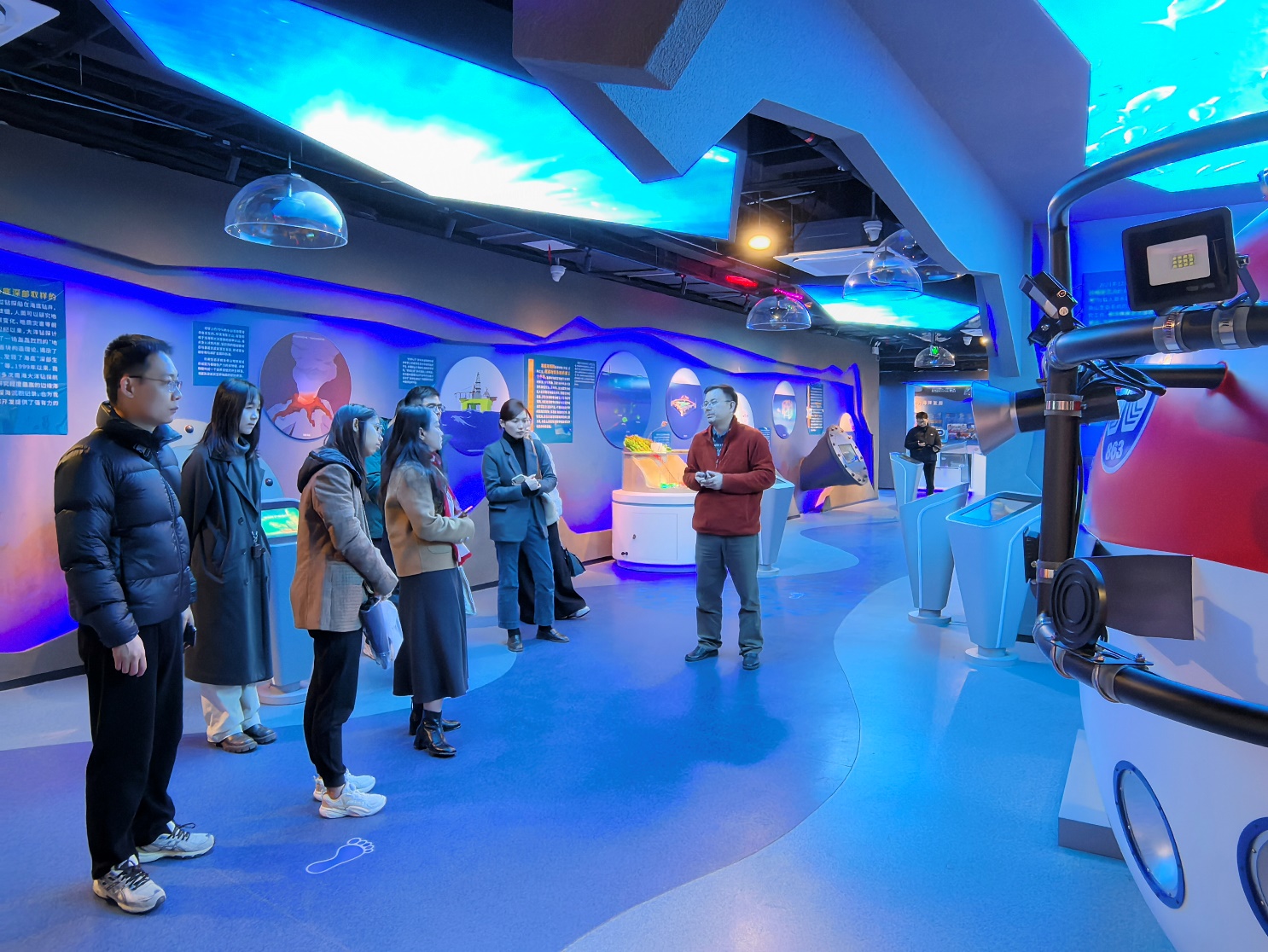 来访代表一行在太阳集团122cc海洋科教馆常务副馆长李周佳的陪同下参观考察太阳集团122cc和海洋科教馆。代表们高度认可公司在海洋科学教育、科研成果转化及科普平台建设方面取得的成果。