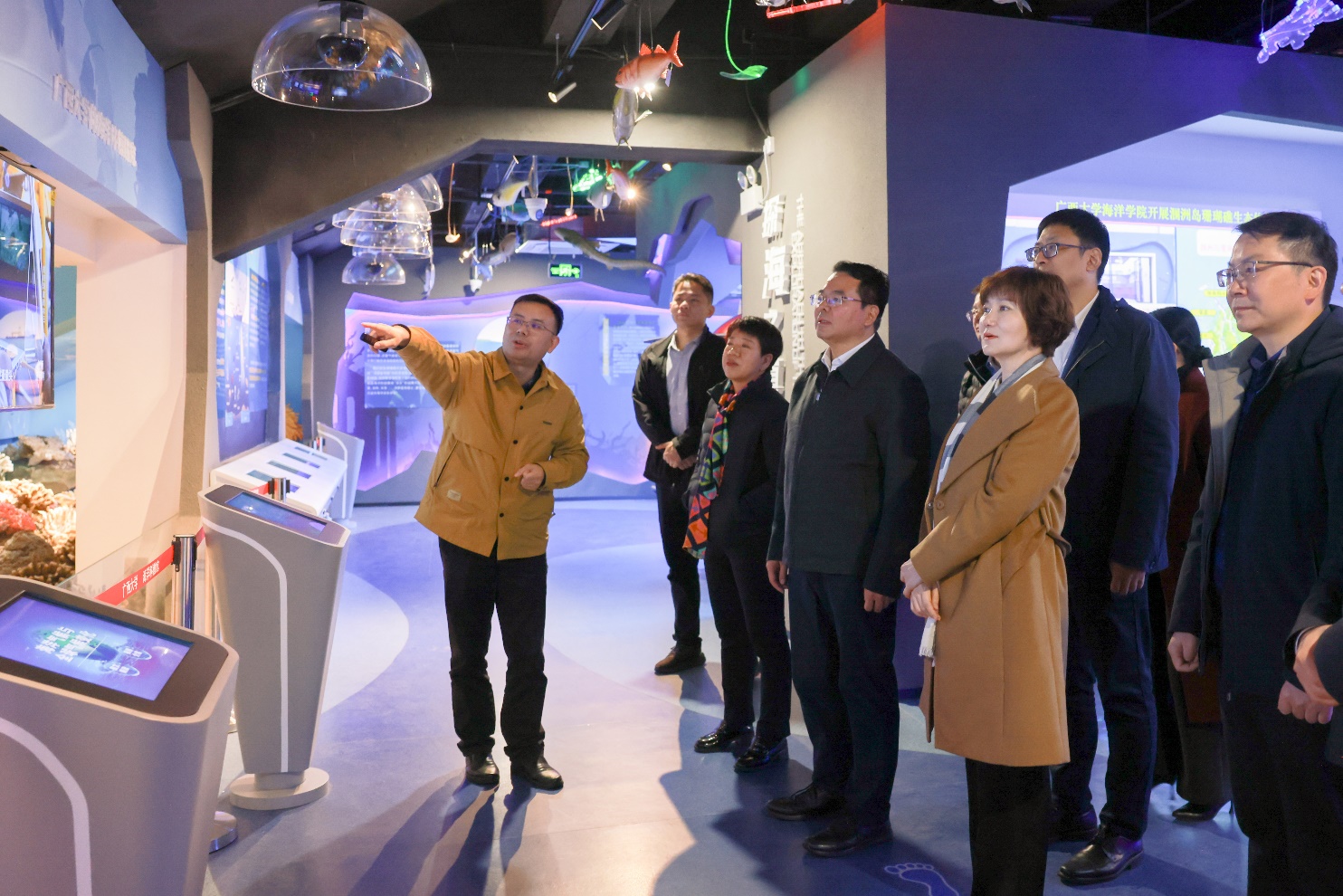 在海洋科教馆,常务副馆长李周佳介绍了太阳集团122cc依托珊瑚礁研究形成的科学研究特色:公司以珊瑚礁与全球变化之间的关系为研究主线,面向国家重大需求和学科发展前沿,瞄准我国南海珊瑚礁研究和应用所面临的关键科学问题,通过多学科交叉融合和综合集成,揭示珊瑚礁学科的规律,并致力于建设中国最高水平的珊瑚礁科学研究和人才培养基地。他还汇报了公司在南海、太平洋和印度洋开展综合科学考察情况以及公司服务国家岛礁建设工程等方面的工作进展。展示了公司“科研+教学+社会服务”三位一体的特色办学模式。