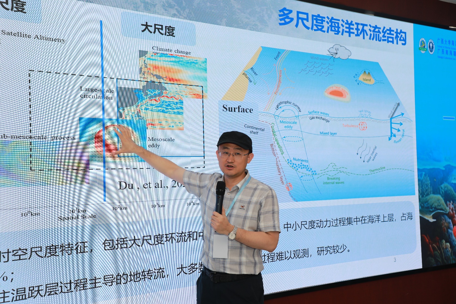 杜岩在报告中深入浅出地阐述了海洋动力过程研究的重要性及面临的挑战。他指出,海洋近表层海流蕴含巨大能量,涉及多空间和时间尺度的过程,然而目前的海流速度实测数据有限且稀疏,直接卫星测量全球海洋表面海流尚未实现,广泛使用的海流数据多基于卫星海面高度反演的地转流和表面漂流浮标轨迹反算的海流,这些数据集难以满足海洋非平衡过程研究的需求。
