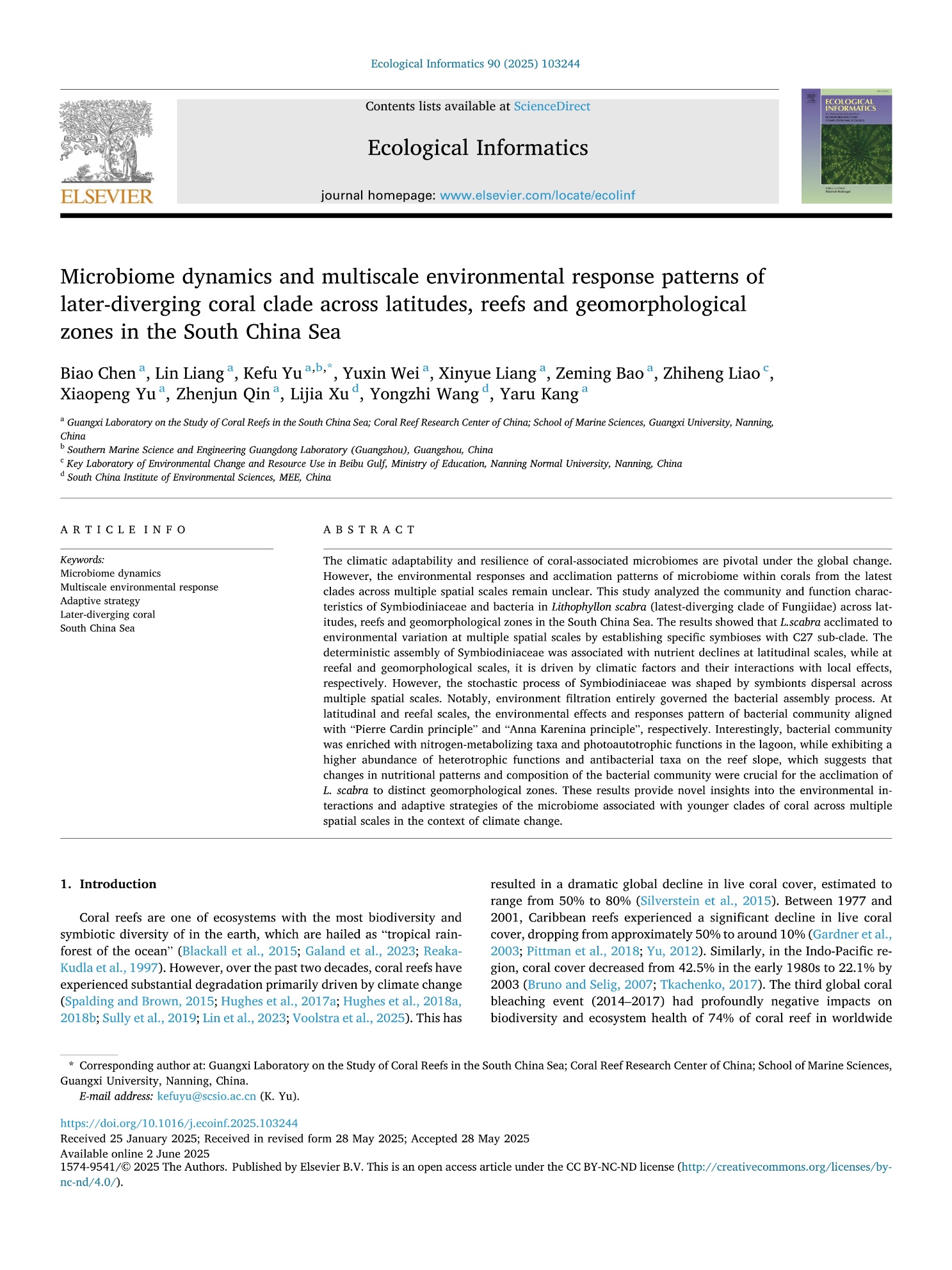 Chen, B., Liang, L., Yu, K., Wei, Y., Liang, X., Bao, Z., Liao, Z., Yu, X., Qin, Z., Xu, L., Wang, Y., and Kang, Y. (2025). Microbiome dynamics and multiscale environmental response patterns of later-diverging coral clade across latitudes, reefs and geomorphological zones in the South China Sea. Ecol. Inform. 90, 103244. doi: 10.1016/j.ecoinf.2025.103244.