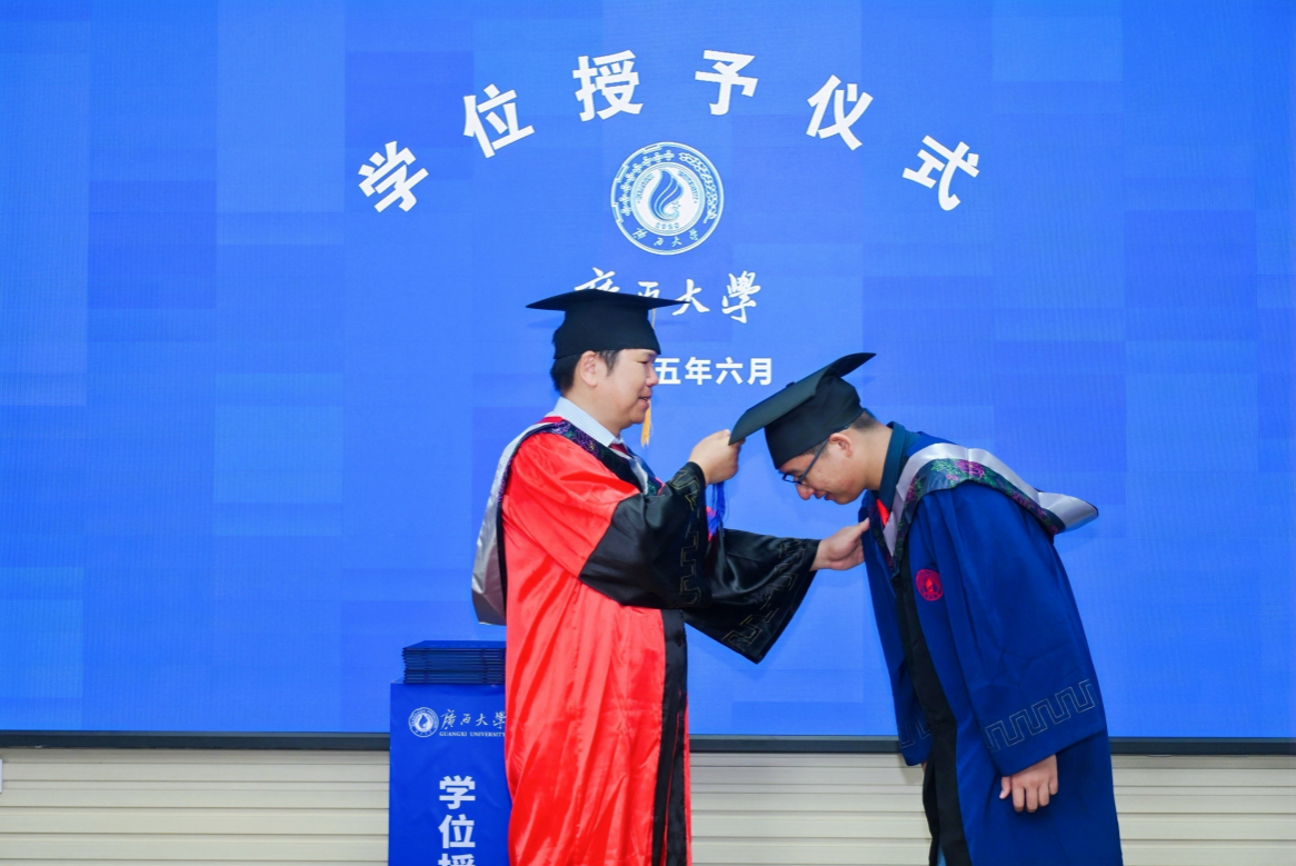 在最激动人心的学位授予环节,余克服经理逐一给毕业生进行拨穗礼、授予学位、颁发学位证书,并合影留念。