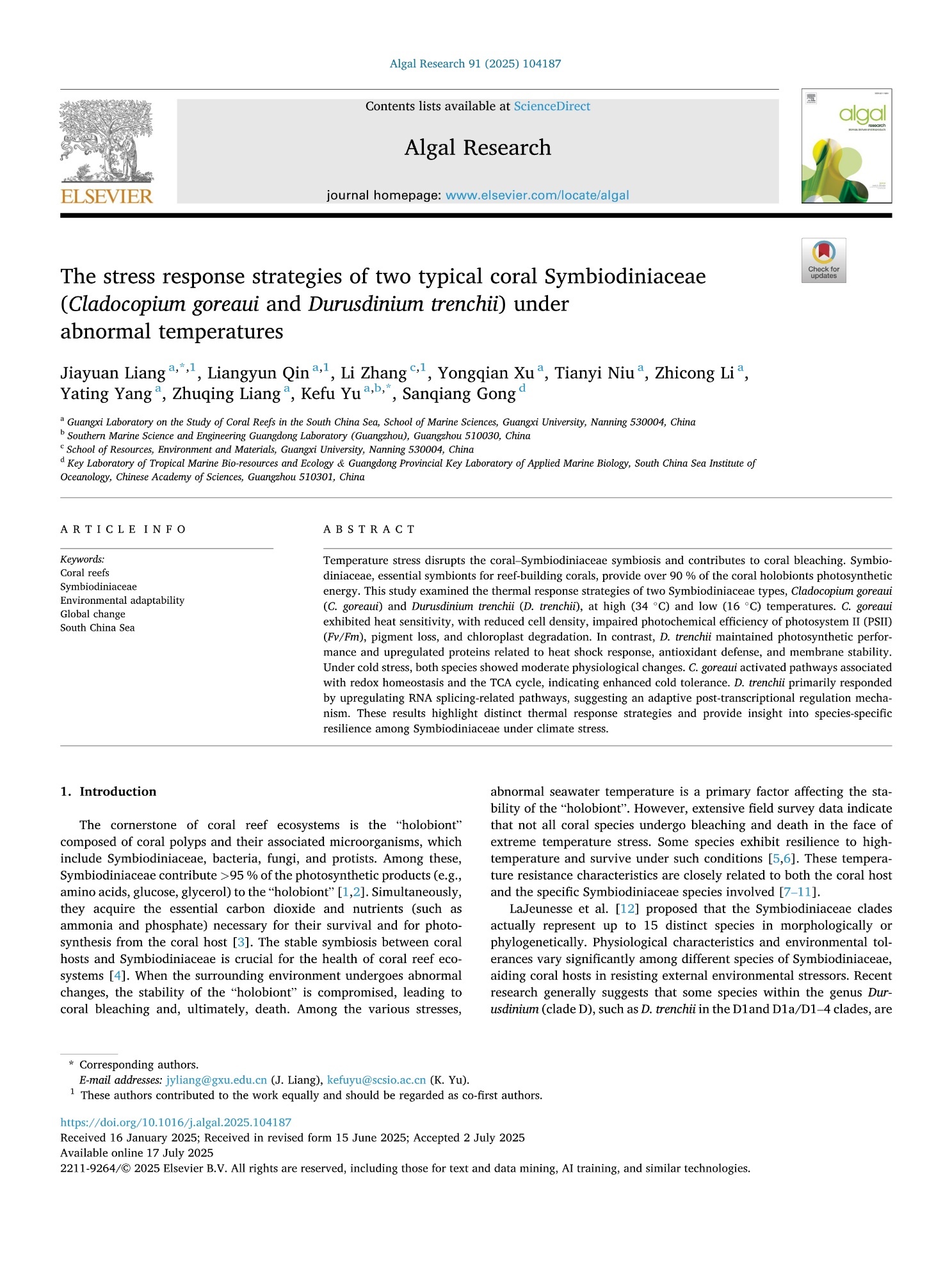 Jiayuan Liang, Liangyun Qin, Li Zhang, Yongqian Xu, Tianyi Niu, Zhicong Li, Yating Yang, Zhuqing Liang, Kefu Yu*, Sanqiang Gong. The stress response strategies of two typical coral Symbiodiniaceae (Cladocopium goreaui and Durusdinium trenchii) under abnormal temperatures. Algal Research, 91 (2025) 104187.