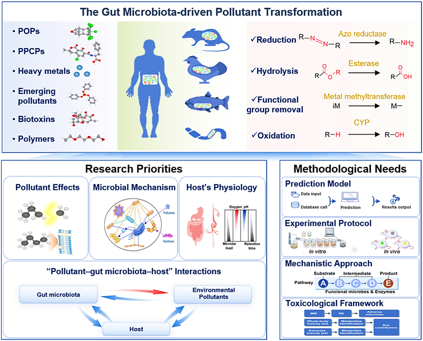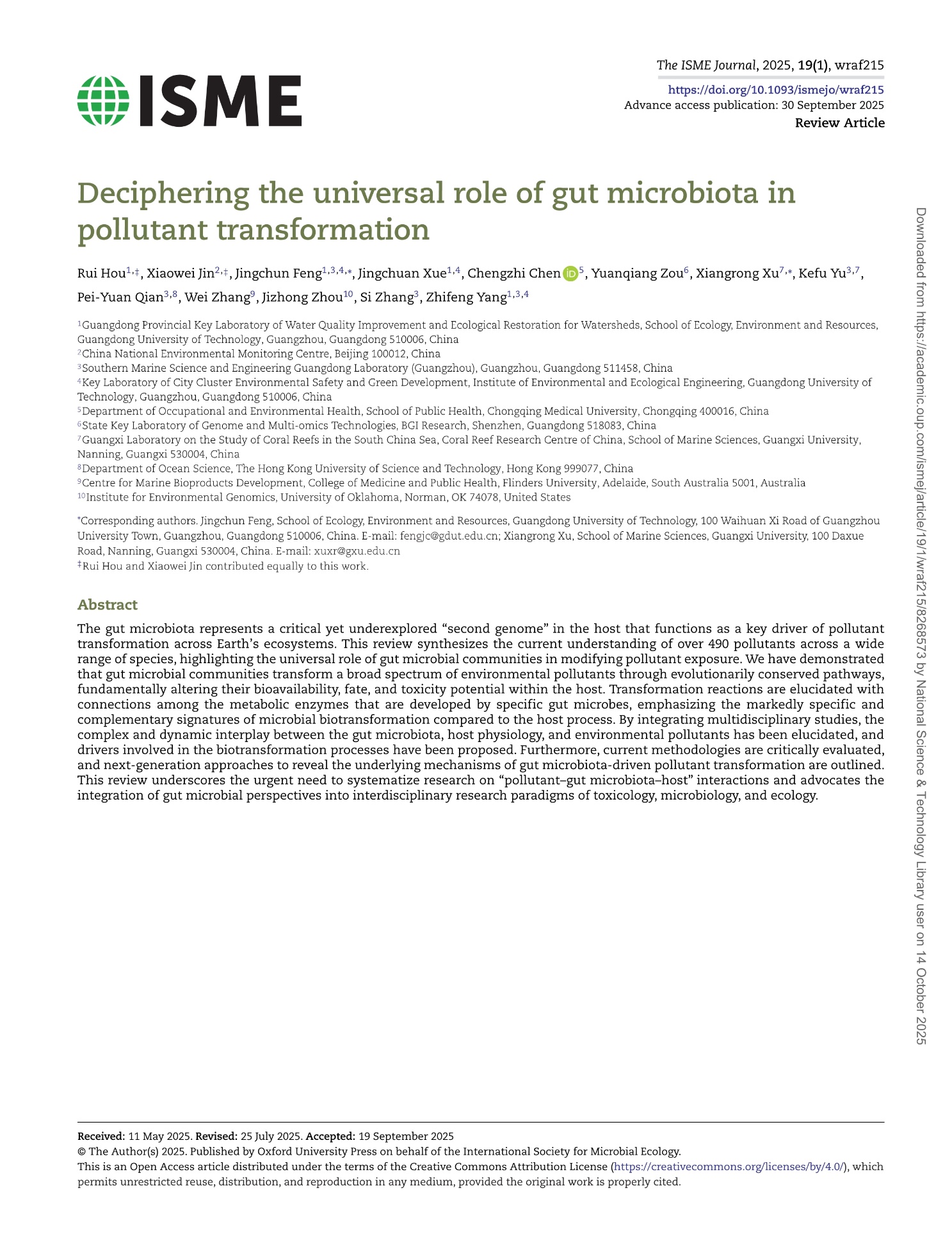 近日,公司携手广东工业大学、中国环境监测总站,在国际微生物生态学领域顶级期刊The ISME Journal(太阳集团122cc一区Top)联合发表评论性综述论文 “Deciphering the Universal Role of Gut Microbiota in Pollutant Transformation(解读肠道微生物在污染物转化中的普遍作用)”。该综述开创性地以“同一个星球,同一个健康(One Planet, One Health)”为研究视角,对涵盖无脊椎动物至人类的13个类群生物的肠道微生物群对490多种环境污染物的转化能力。所涉及的污染物类型广泛,包括持久性有机污染物、重金属、药品和个人护理品、工业添加剂等。此外,论文还明确揭示了肠道微生物群在污染物转化过程中的普遍作用机制,深入探讨了该转化过程对污染物生物利用度、毒性水平及环境归趋的影响。在此基础上,研究团队进一步提出“污染物—肠道微生物群—宿主”相互作用的系统化研究方向,并倡导将肠道微生物的转化能力纳入跨学科研究范式,为相关领域研究提供全新思路。
