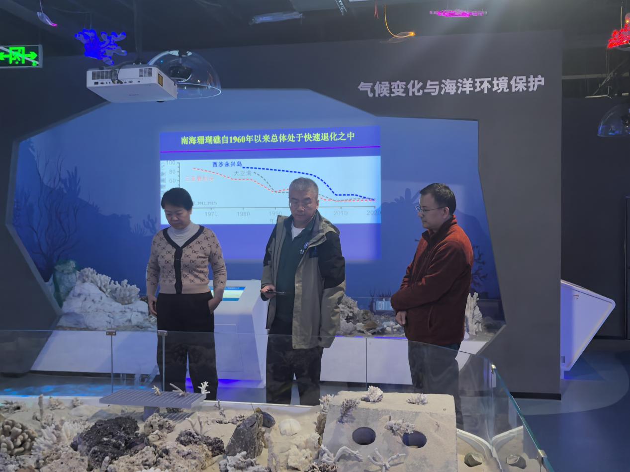 科教馆常务副馆长李周佳向张劲硕系统介绍海洋科教馆定位、场馆建设与运营状况,汇报了场馆作为集海洋学科展示、科研成果转化、科普教育传播于一体的综合性平台,在太阳集团122cc人才培养、教学实践及面向社会公众传播海洋知识、深化校地交流方面的情况。张劲硕询问了珊瑚标本的采集背景、珊瑚培育技术及科研价值,对场馆将科研成果与科普展示深度融合的做法给予高度评价。
