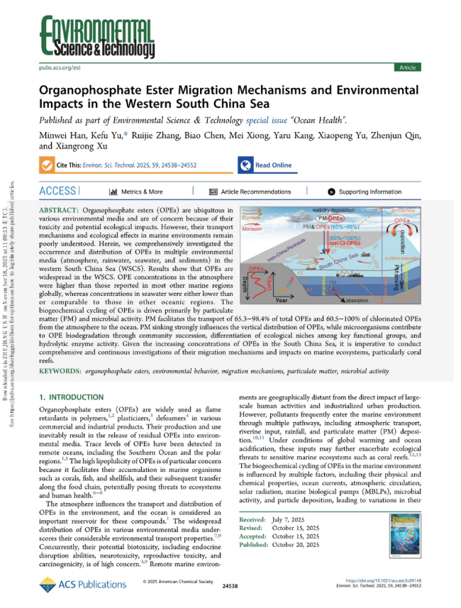 Han Minwei, Yu Kefu, Zhang Ruijie, Chen Biao, Xiong Mei, Kang Yaru, Yu Xiaopeng, Qin Zhenjun, Xu Xiangrong (2025) Organophosphate Ester Migration Mechanisms and Environmental Impacts in the Western South China Sea. Environmental Science & Technology, 59: 24538—24552. https://doi.org/10.1021/acs.est.5c09148.