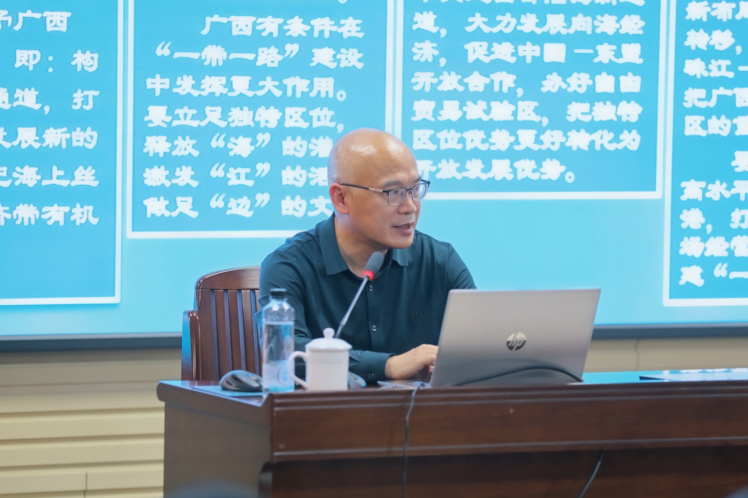 报告中,宁向军深入解读了习近平总书记关于“关心海洋、认识海洋、经略海洋”的重要论述,系统梳理了党的十八大以来海洋强国建设的重大战略部署,并结合广西实际,用翔实的数据展示了广西海洋资源禀赋、海洋经济构成及发展成效。他重点介绍了广西在临港产业、海洋旅游、海上风电、硅基新材料等领域的积极进展,解读了国家“十五五”规划及自治区相关政策对海洋经济的支持导向,详细阐释了广西“陆海统筹、山海协作、江海贯通、边海衔接”的发展布局和“一核两区十带”的战略规划,强调广西作为面向东盟的国际大通道,拥有独特的区位优势和政策机遇,发展向海经济是实现跨越式发展的必由之路。