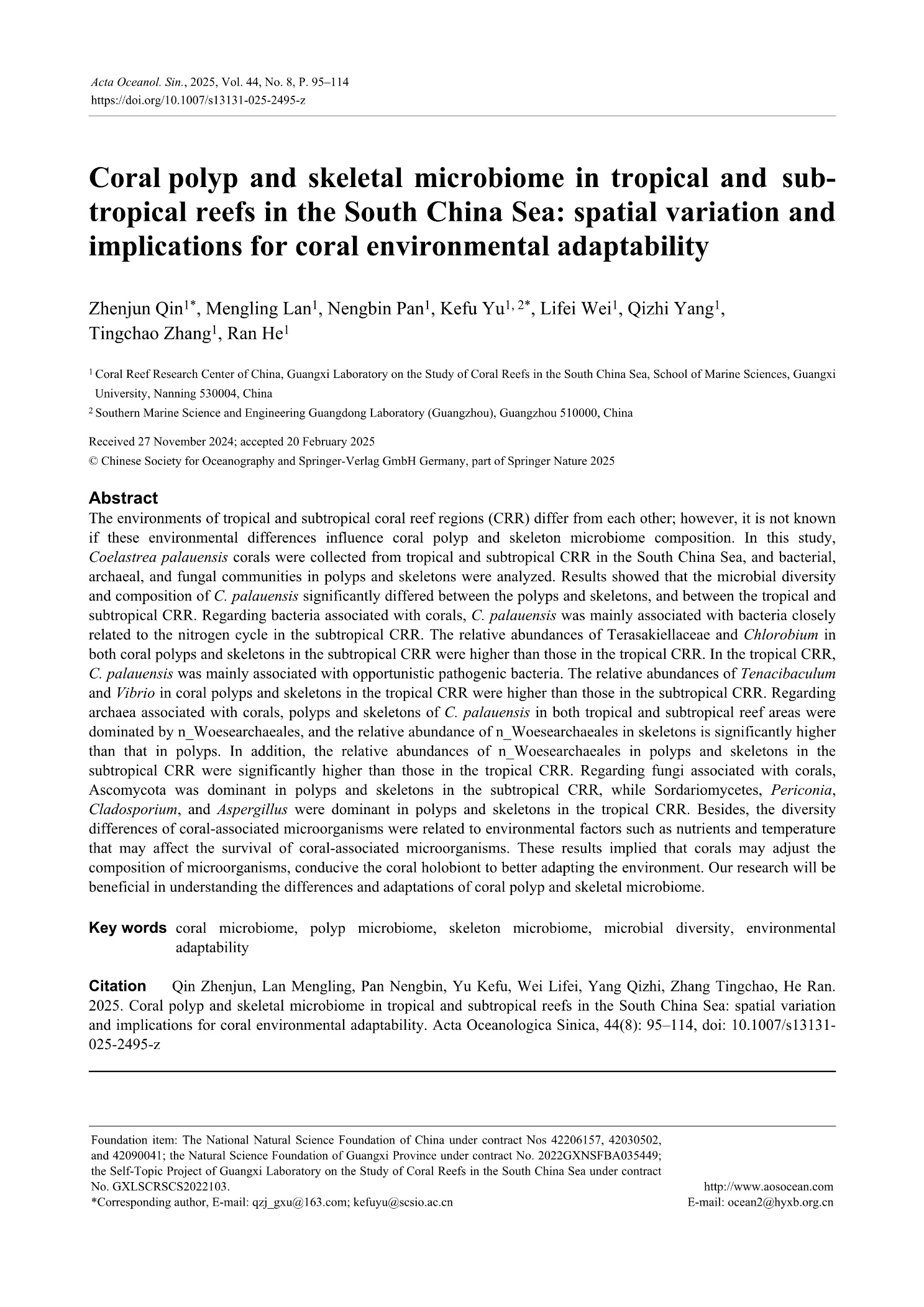 Qin Zhenjun, Lan Mengling, Pan Nengbin, Yu Kefu, Wei Lifei, Yang Qizhi, Zhang Tingchao, He Ran. Coral polyp and skeletal microbiome in tropical and subtropical reefs in the South China Sea: spatial variation and implications for coral environmental adaptability. Acta Oceanologica Sinica, 2025, 44(8): 1-19. https://doi.org/10.1007/s13131-024-0000-00