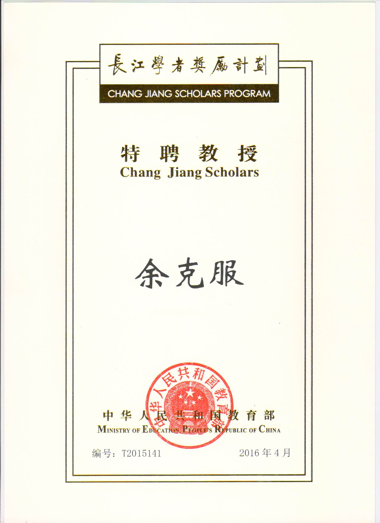 • 2015年,教育部“长江学者”特聘教授、政府特殊津贴获得者